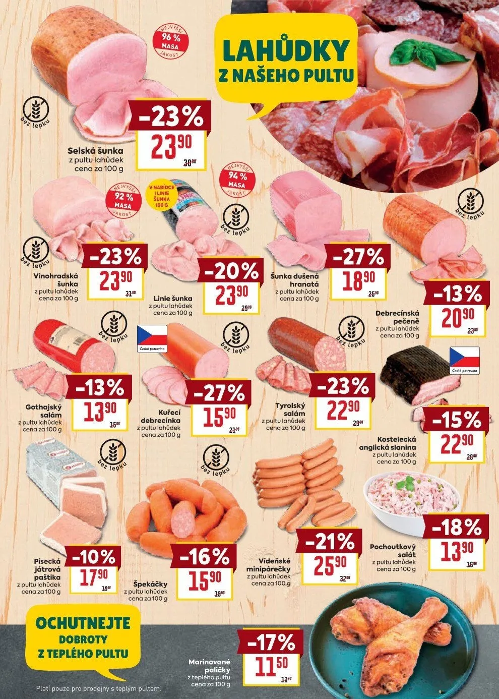 V letáku obchodu BILLA najdete širokou nabídku lahůdek z pultu. Mezi nimi se pyšní selská šunka s 92 % masa, vinohradská šunka s 94 % masa a gothajský salám. Dále nabízíme synku dušenou hranatou a debrecínskou pečeni, obě s výhodnou cenou za 100 g. Nezapomeňte také na kosteleckou anglickou slaninu a pochoutkový salát, které jsou skvělou volbou pro každou příležitost. Pro milovníky paštik máme píseckou játrovou paštiku a špekáčky, které potěší každého gurmána. A pokud máte chuť na něco teplého, ochutnejte naše marinované paličky a vídeňské minipárečky. Všechny produkty jsou k dostání za výhodné ceny. Platí pouze pro prodejny s teplým pultem.