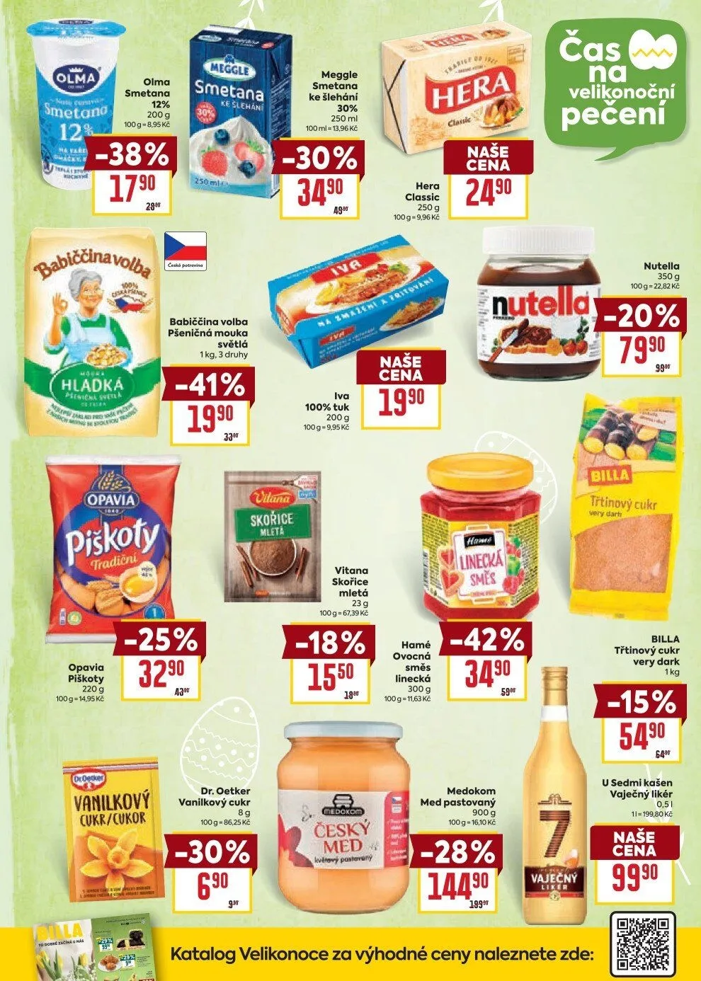 V letáku obchodu BILLA najdete širokou nabídku produktů ideálních pro velikonoční pečení. Mezi nimi je smetana Olma 12% (200 g) za skvělou cenu 17,90 Kč. Dále nabízíme pšeničnou mouku Babiččina volba (1 kg) a tradiční piškoty Opavia, které jsou nyní ve slevě. Nezapomeňte na smetanu ke šlehání Meggle (250 ml) a mletou skořici Vitana (23 g) pro dokonalou chuť vašich dezertů.
