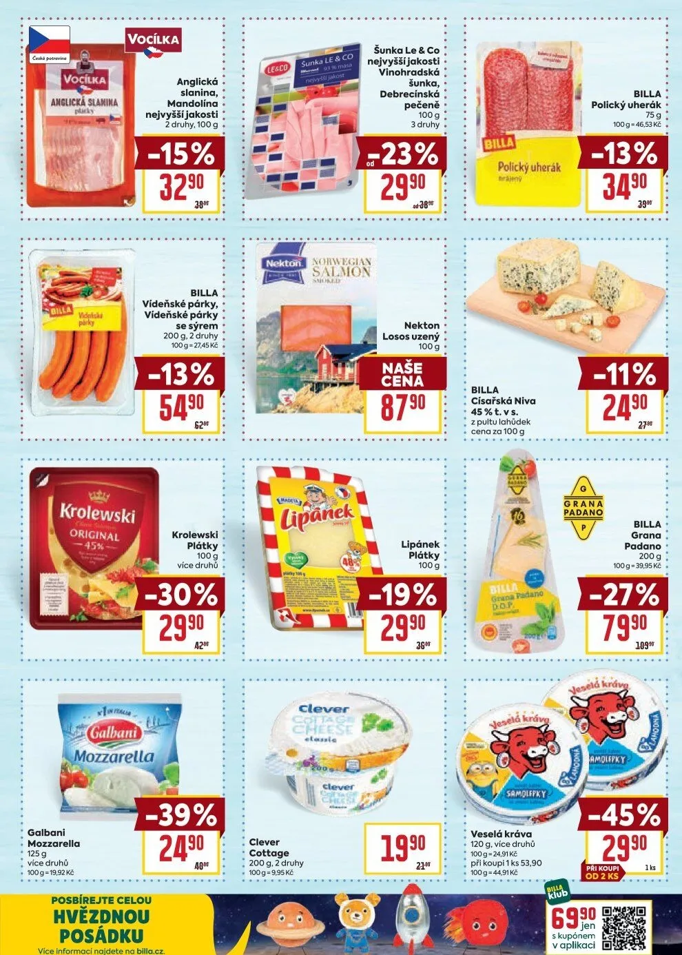 V letáku obchodu BILLA najdete širokou nabídku kvalitních produktů. Mezi nimi se objevují lahodné vídeňské párky, které jsou k dispozici ve dvou variantách, a to se sýrem nebo bez. Dále si můžete vybrat z různých druhů šunky, jako je vinohradská nebo debrecínská, všechny v nejvyšší jakosti.