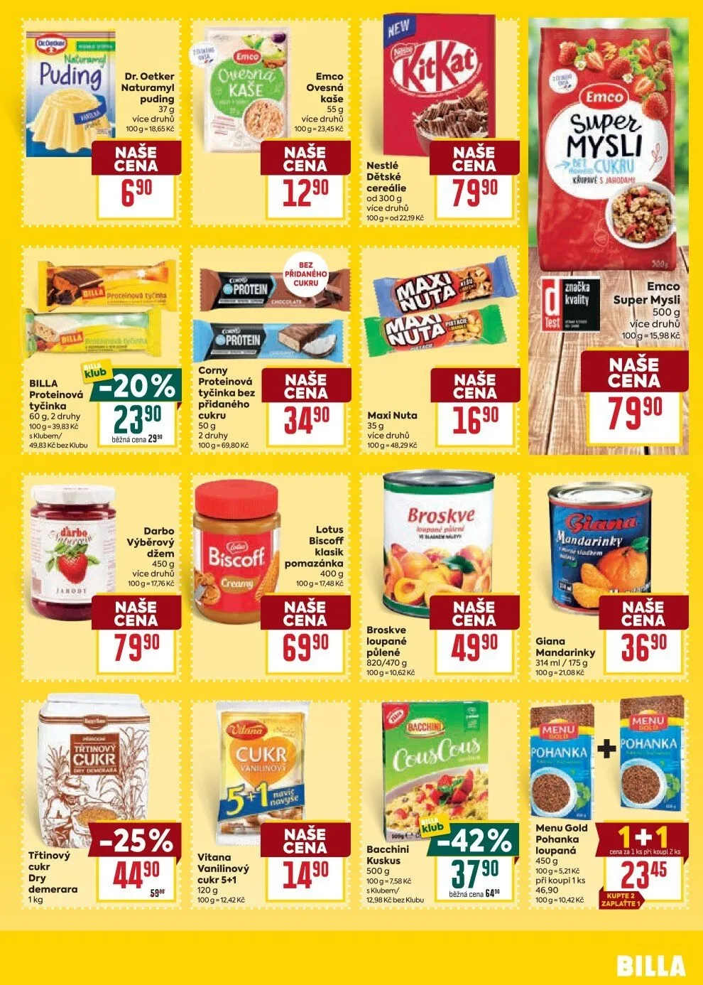 V letáku obchodu BILLA najdete širokou nabídku produktů, které potěší každého zákazníka. Mezi nimi je puding Dr. Oetker v různých druzích, který váží 37 g. Dále si můžete vybrat proteinovou tyčinku Corny bez přidaného cukru o hmotnosti 50 g, dostupnou ve dvou variantách.