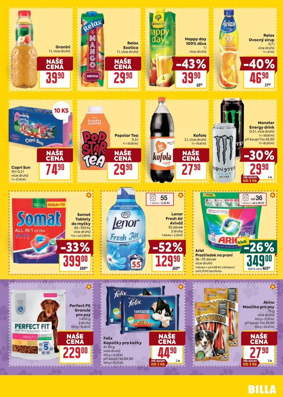 V letáku najdete i aviváže Lenor Fresh Air a prací prostředky Ariel, které jsou k dispozici za výhodné ceny při koupi více kusů. Navštivte BILLA a objevte další skvělé nabídky!