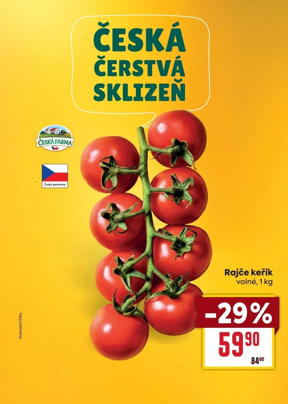V letáku obchodu BILLA najdete širokou nabídku čerstvých produktů z české sklizně. Mezi nimi vyniká rajče keřík, které je k dispozici volně v balení po 1 kg. Tento produkt pochází z české farmy a je ideální pro přípravu zdravých pokrmů. Navíc nyní můžete využít slevu 29 %. Nezapomeňte si ho přidat do svého nákupního seznamu!