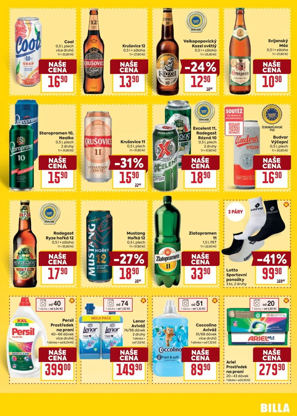 V letáku obchodu BILLA najdete širokou nabídku produktů za skvělé ceny. Mezi oblíbené nápoje patří Staropramen 10 nealko a Radegast Ryze Hořká 12, které jsou k dispozici v plechovkách. Pro milovníky piva máme také Velkopopovického Kozla světlého a Krušovice 12.