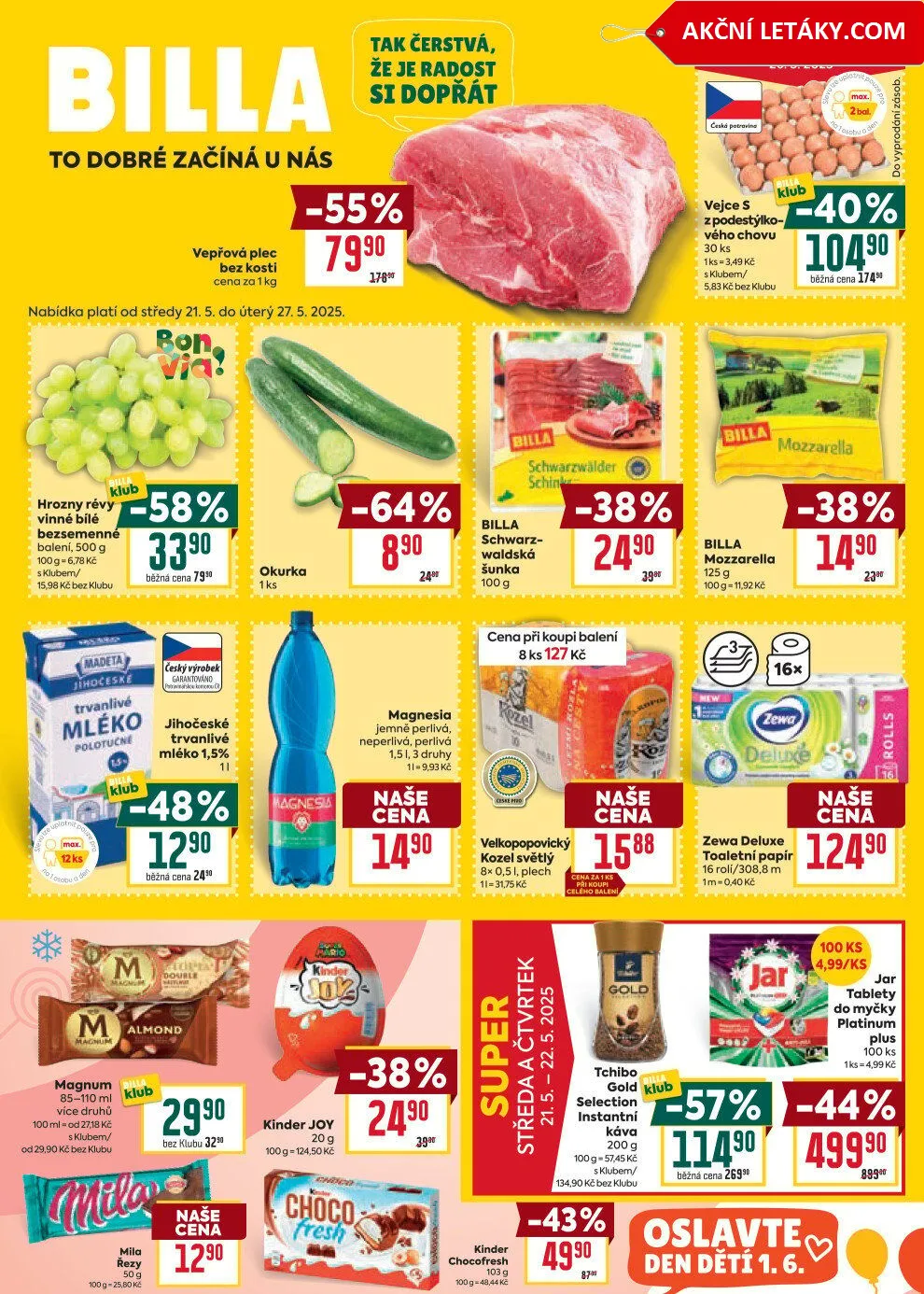 Nezapomeňte také na další produkty jako mozzarella, šunka, toaletní papír Zewa Deluxe a tablety do myčky Jar, které jsou v akci. Nabídka platí od 21. do 27. května 2025. Přijďte si pro své oblíbené produkty a užijte si skvělé ceny!