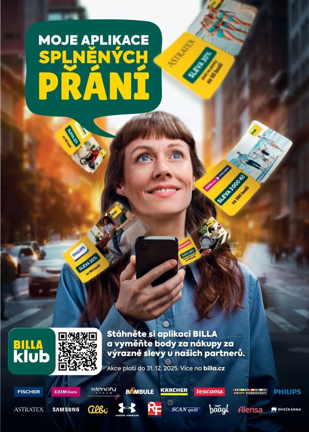 Využijte výhod BILLA klubu a sbírejte body za nákupy, které můžete vyměnit za výrazné slevy u našich partnerů, jako jsou Fischer, Astratex, Samsung, Philips a další.