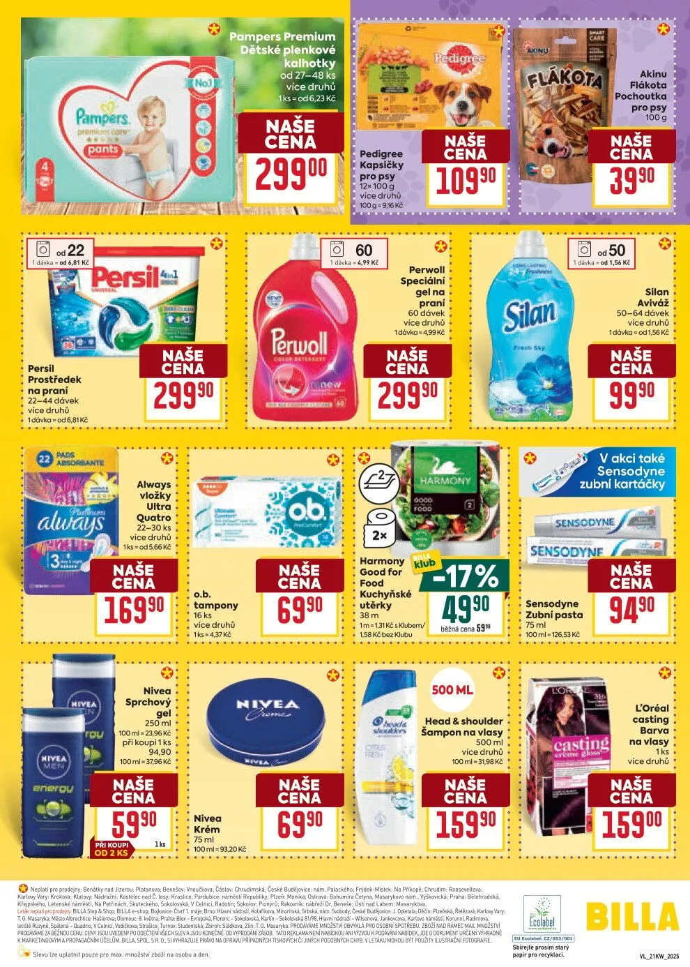 V letáku obchodu BILLA najdete širokou nabídku produktů pro celou rodinu. Mezi nimi jsou dětské plenkové kalhotky Pampers Premium v různých velikostech, které jsou nyní za skvělou cenu. Dále nabízíme prací prostředek Perwoll, který je k dispozici v několika variantách a vydrží až na 60 dávek. Pro vaše čtyřnohé miláčky máme pochoutky Akinu a kapsičky Pedigree, které potěší každého psa.