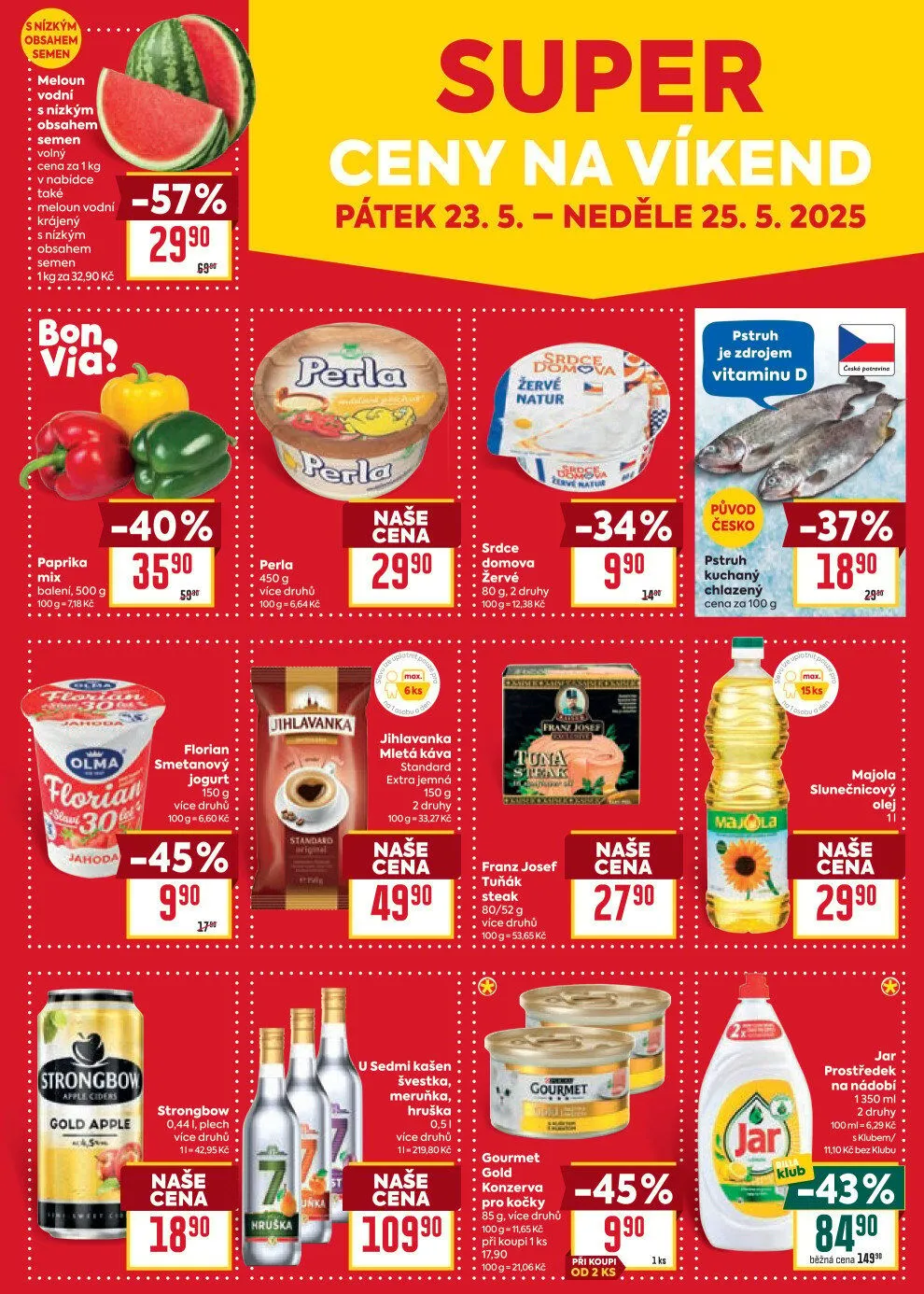 V letáku obchodu BILLA najdete skvělé nabídky na víkend od pátku 23.5. do neděle 25.5.2025. Mezi produkty se objevují melouny s nízkým obsahem semen, které jsou k dostání za 3,90 Kč za 1 kg. Dále je v nabídce paprika mix v balení 500 g za 29,90 Kč.