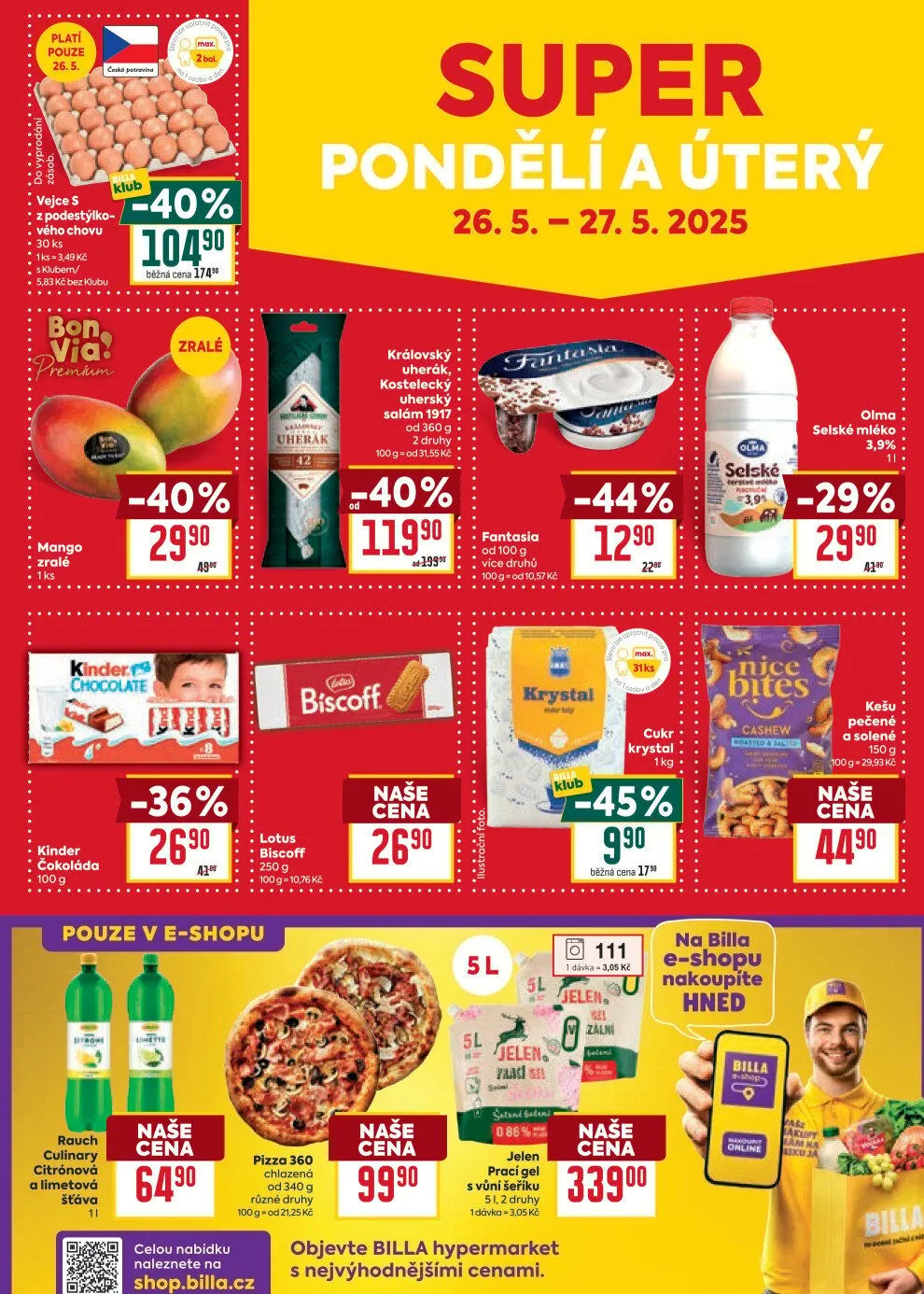 V letáku obchodu BILLA najdete širokou nabídku produktů za skvělé ceny. Mezi nimi jsou vejce z podestýlkového chovu, balení 30 ks za 583 Kč s bonusem pro členy klubu. Dále si můžete pořídit zralé mango se slevou 40 % a královský uherák nebo kostelecký salám, které jsou také ve slevě.