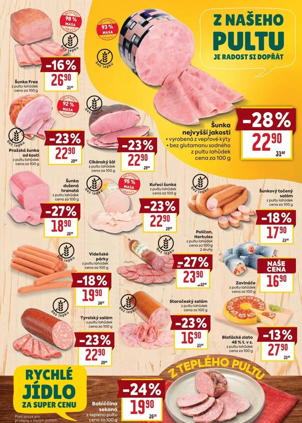 Dále si můžete dopřát cikánský šál, šunku nejvyšší jakosti bez glutamanu sodného, šunkový točený salám a kuřecí šunku, všechny za výhodné ceny. Nezapomeňte také na vídeňské párky a tyrolský salám, které jsou v akci.