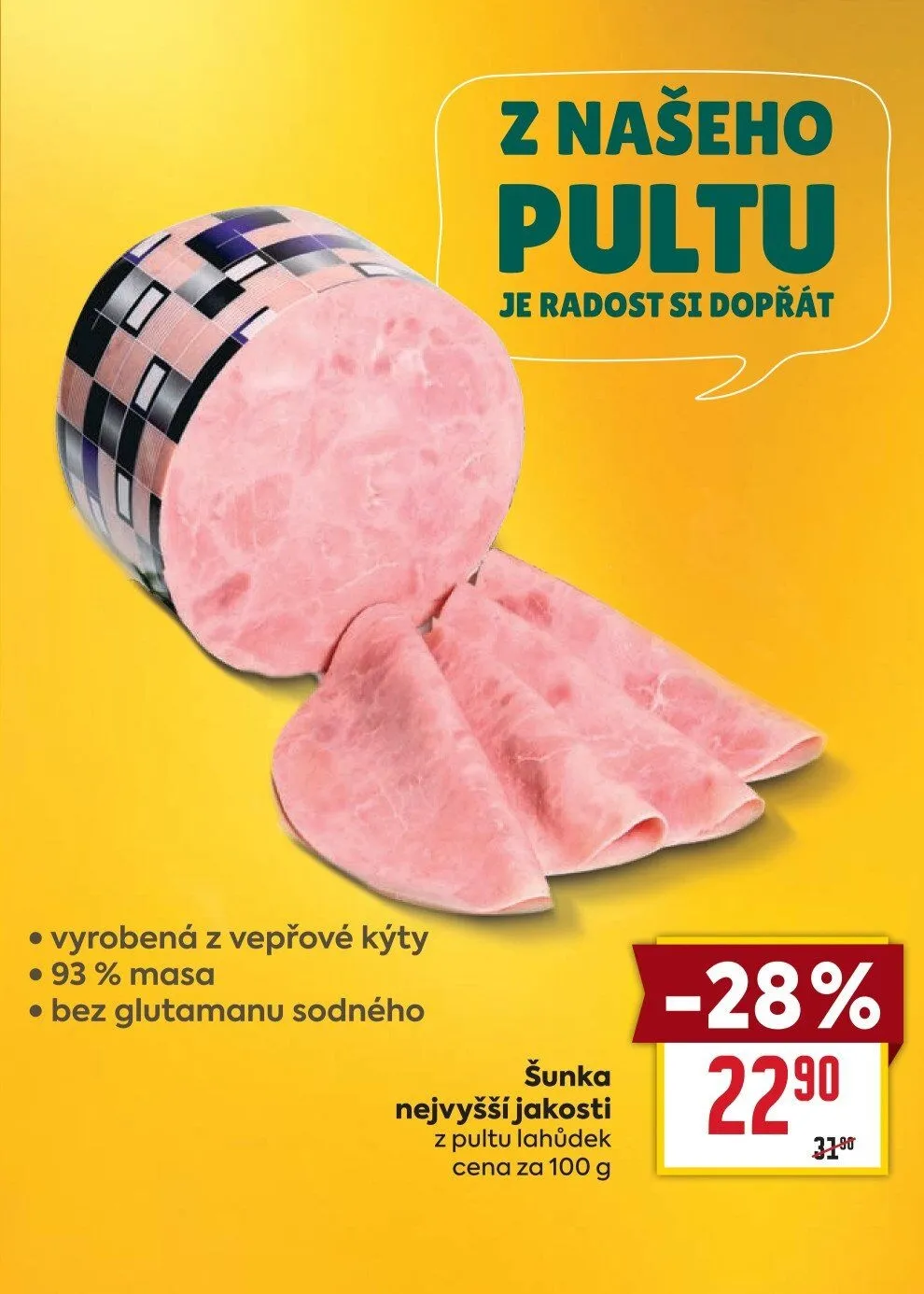 V letáku obchodu BILLA najdete šunku nejvyšší jakosti, vyrobenou z vepřové kýty. Obsahuje 93 % masa a neobsahuje glutamát sodný. Tato lahůdka je k dispozici na pultu s cenou za 100 g. Nezapomeňte využít akční slevu, která činí 28 %.