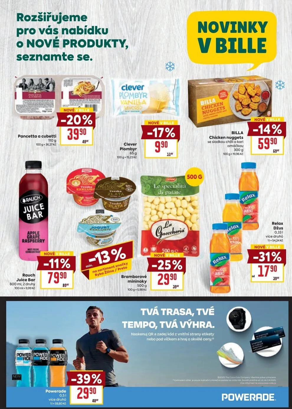 V letáku obchodu BILLA najdete širokou nabídku nových produktů, které si můžete vychutnat. Mezi novinkami se objevují například pancetta a cubetti (110 g) za 99 Kč, bramborové mininoky (500 g) za 299 Kč, nebo chicken nuggets se sladkou chilli a kari omáčkou (300 g) za 599 Kč. Nezapomeňte také na relax džus (800 ml) za 179 Kč a Powerade (0,51 l) za 29 Kč. Objevte skvělé ceny a nové chutě v BILLE!