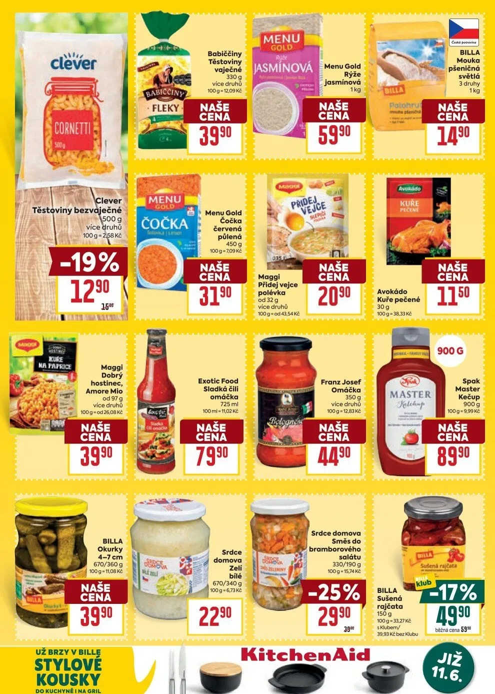 V letáku obchodu BILLA najdete širokou nabídku kvalitních produktů za skvělé ceny. Mezi nimi jsou například vaječné těstoviny Babiččiny, které jsou k dostání v různých druzích za cenu 39,90 Kč. Dále si můžete vybrat z červené čočky půlené Menu Gold za 31,90 Kč nebo sladkou čili omáčku Exotic Food za 79,90 Kč.