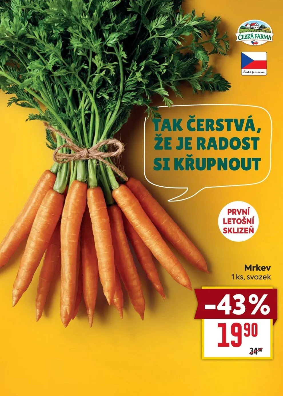 V letáku obchodu BILLA najdete skvělé produkty od českých farmářů. Mezi nimi vyniká čerstvá mrkev, která je radostí si křupnout. První letošní sklizeň je nyní k dispozici v praktickém svazku po 1 ks. Nezapomeňte si ji přidat do svého nákupního košíku!