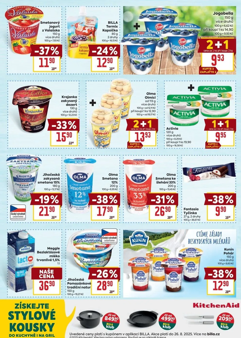 V letáku najdete i další produkty jako smetanu ke šlehání, pomazánkové máslo a různé tyčinky. Všechny ceny platí s kupónem v aplikaci BILLA a akce trvá do 26.8. 2025. Navštivte billa.cz pro více informací!