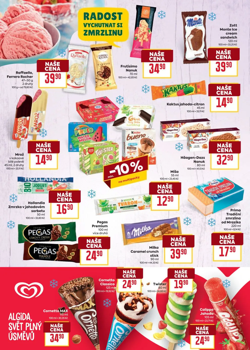 Pokud máte rádi nanuky, doporučujeme Haagen Dazs s příchutí kaktusu, jahody a citronu za 24,90 Kč. Nezapomeňte také na Monte Ice Sandwich, který je k dostání za 39,90 Kč. Pro osvěžení v horkých dnech si můžete vybrat Calippo jahoda za 24,90 Kč nebo Cornetto Max od Algidy za 34,90 Kč.