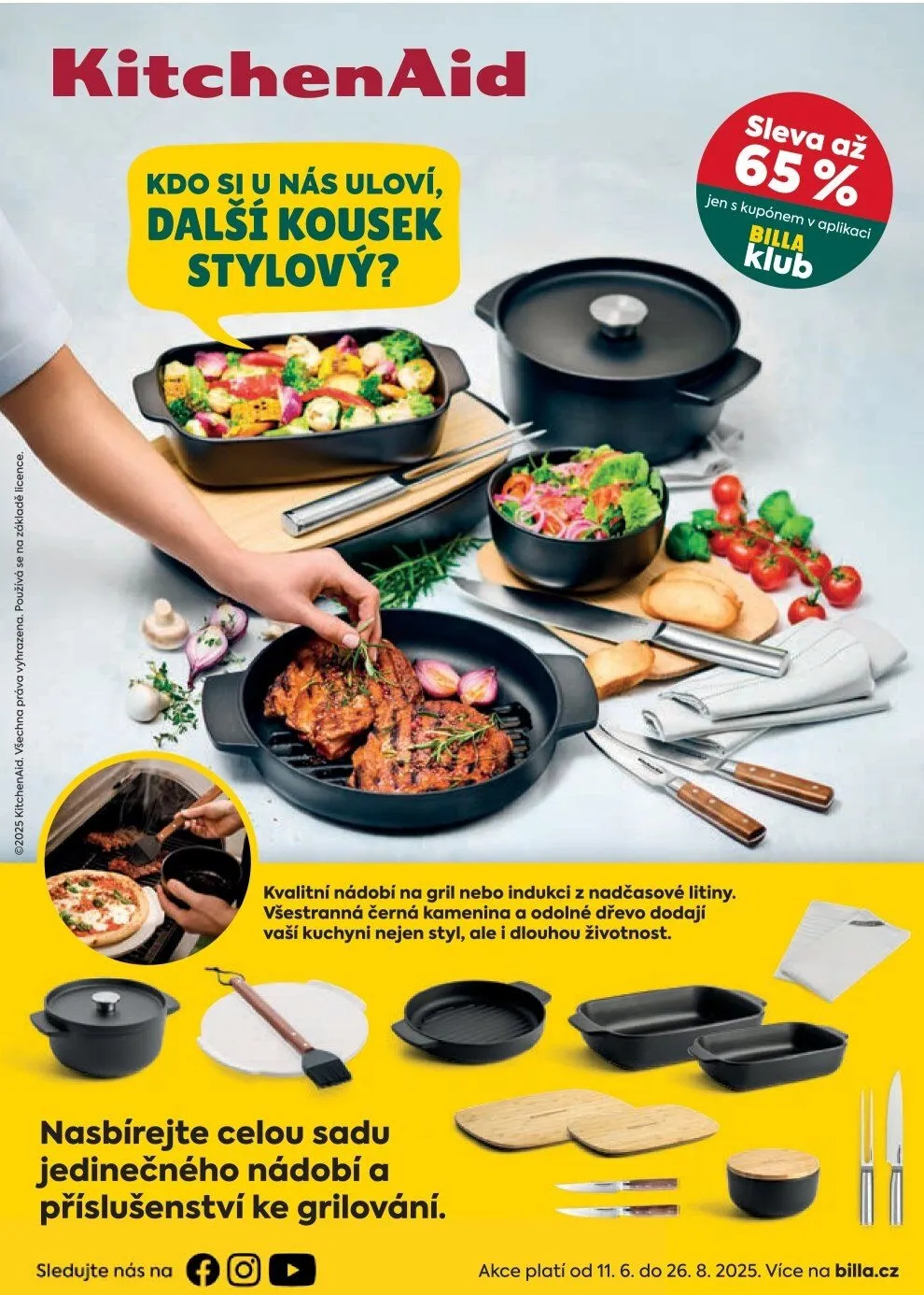 V letáku obchodu BILLA najdete skvělé produkty značky KitchenAid. Pokud si u nás ulovíte další stylový kousek, můžete využít slevu až s kupónem. Nabízíme kvalitní nádobí na gril nebo indukci z nadčasové litiny. Všestranná černá kamenina a odolné dřevo dodají vaší kuchyni nejen styl, ale i dlouhou životnost. Nasbírejte celou sadu jedinečného nádobí a příslušenství ke grilování. Akce platí od 11. 6. do 26. 8. 2025. Více informací naleznete na billa.cz.