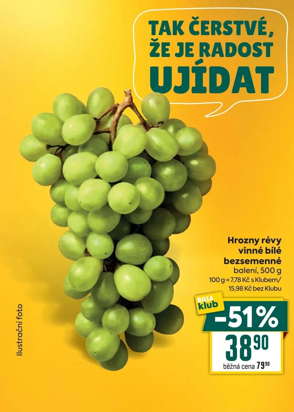 V letáku obchodu BILLA najdete skvělé nabídky na čerstvé produkty. Například hrozny révy vinné bílé bezsemenné, které jsou baleny po 500 g. S klubovou kartou je cena 100 g pouze 7,78 Kč, což je výhodná nabídka. Běžná cena těchto hroznů je 79,90 Kč, takže nyní můžete ušetřit až 51 %. Nezapomeňte využít výhod členství v klubu!