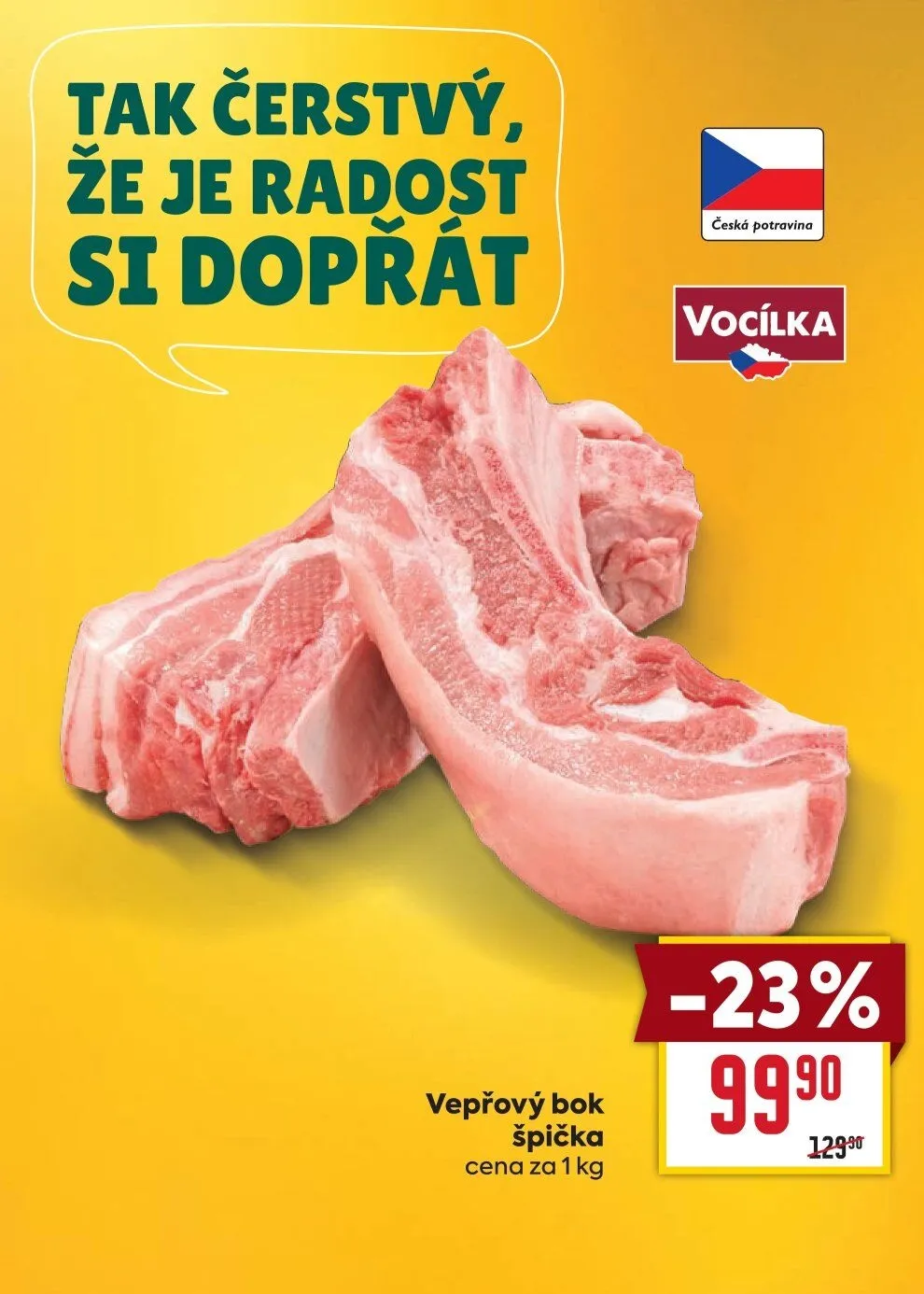 V letáku obchodu BILLA najdete skvělé nabídky na čerstvé české potraviny. Mezi nimi vyniká vepřový bok značky Vocílka, který je nyní k dispozici se slevou 23 %. Tento kvalitní produkt je ideální pro přípravu různých pokrmů a jeho cena za 1 kg vás určitě potěší. Dopřejte si radost z čerstvých a chutných surovin!