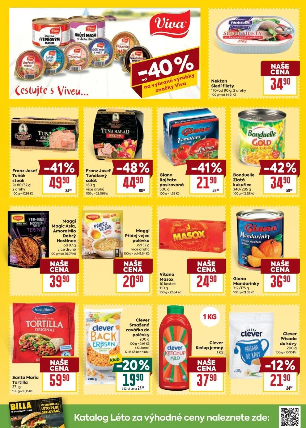 V letáku obchodu BILLA najdete širokou nabídku kvalitních produktů za výhodné ceny. Mezi nimi se objevují pasírovaná rajčata značky Vitana, které jsou k dispozici v balení 500 g za 438 Kč/100 g. Dále si můžete vybrat masox s 10 kostkami za 22,64 Kč/100 g.