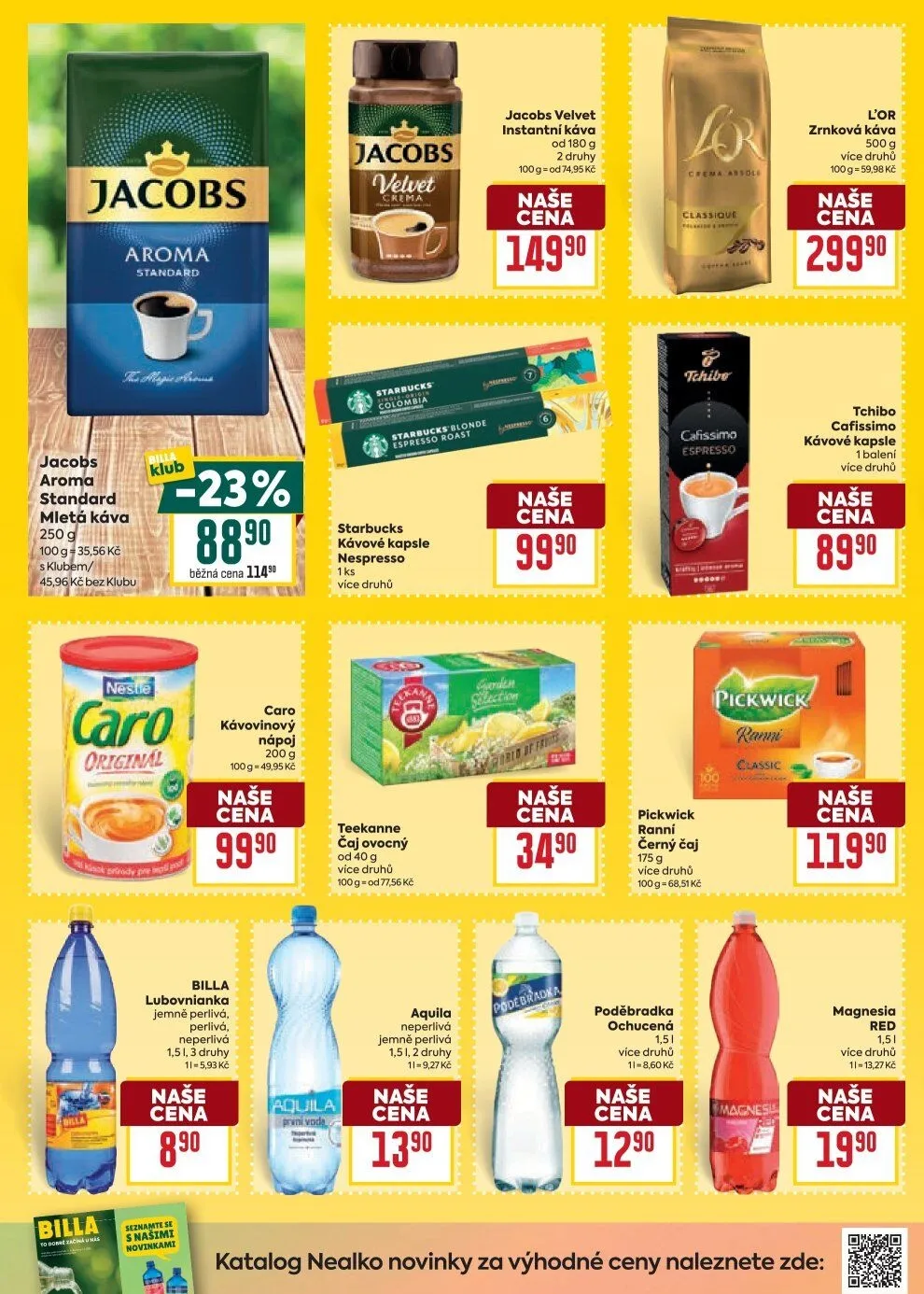 V letáku obchodu BILLA najdete širokou nabídku kvalitních produktů. Mezi nimi se objevují kávové kapsle značek Jacobs, Starbucks a Tchibo, které jsou k dispozici v různých variantách. Pro milovníky čaje máme ovocné čaje Teekanne a černý čaj Pickwick. Nezapomněli jsme ani na nealkoholické nápoje, jako jsou jemně perlivé a neperlivé vody Aquila a Poděbradka. Všechny produkty jsou nabízeny za výhodné ceny, které potěší každého zákazníka. Navštivte nás a objevte naše novinky!