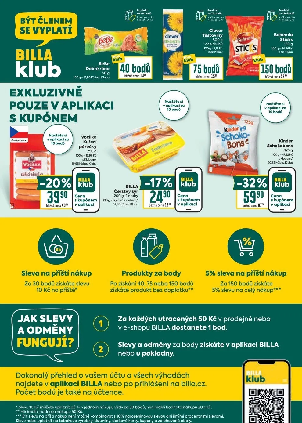 Nezapomeňte využít výhod členství v klubu BILLA, kde za nasbírané body můžete získat slevy na další nákupy. Například za 30 bodů získáte slevu 10 Kč na příští nákup. V aplikaci BILLA můžete také načíst kupóny a získat další výhody.
