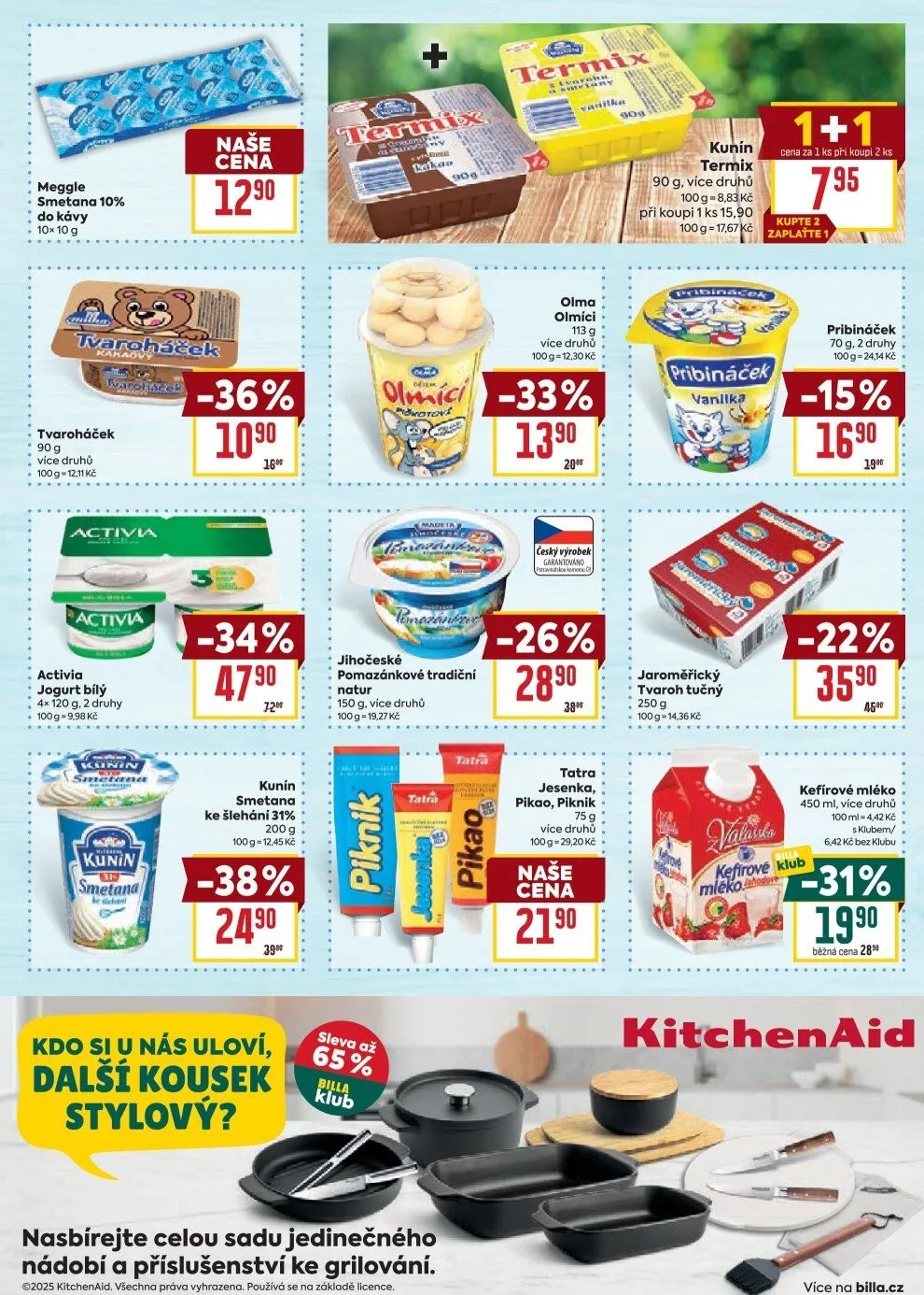 V letáku obchodu BILLA najdete širokou nabídku kvalitních mléčných výrobků. Mezi nimi se objevuje smetana do kávy Meggle za skvělou cenu 12,90 Kč. Dále nabízíme tvaroháček v různých druzích, který je k dostání za 11,11 Kč. Nezapomeňte také na jogurt Activia, který si můžete vychutnat v bílém provedení za 10,90 Kč.