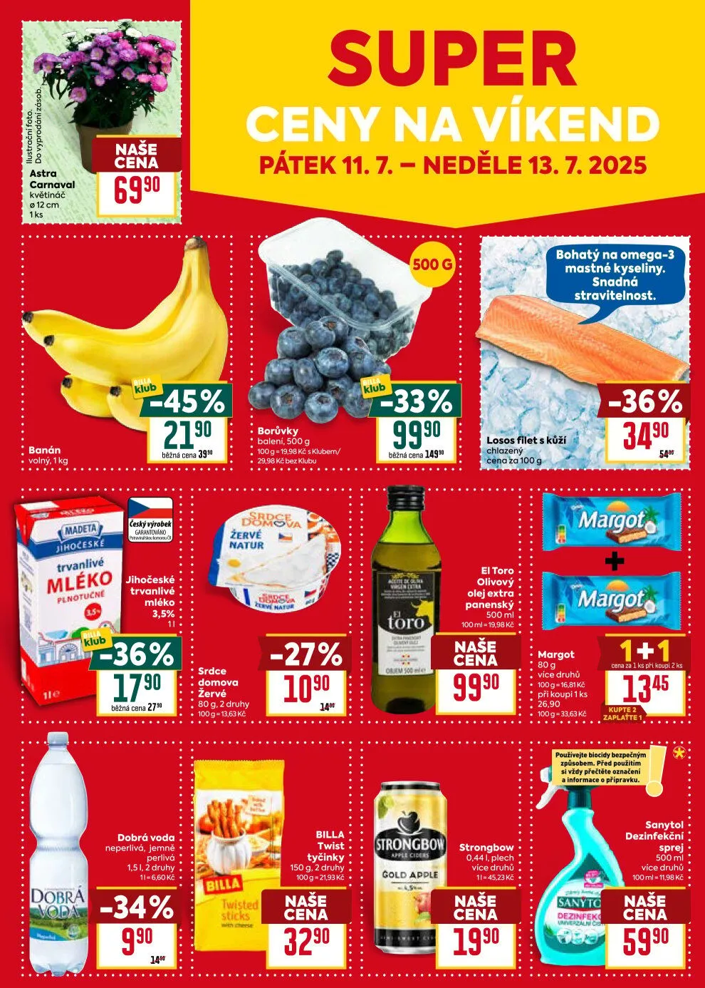 V letáku obchodu BILLA na víkend od pátku 11.7. do neděle 13.7.2025 najdete skvělé nabídky. Například trvanlivé mléko 500 g za výhodnou cenu, které je českým výrobkem z Jihočeského kraje. Dále si můžete pořídit borůvky v balení 500 g nebo čerstvé banány za kilogram.
