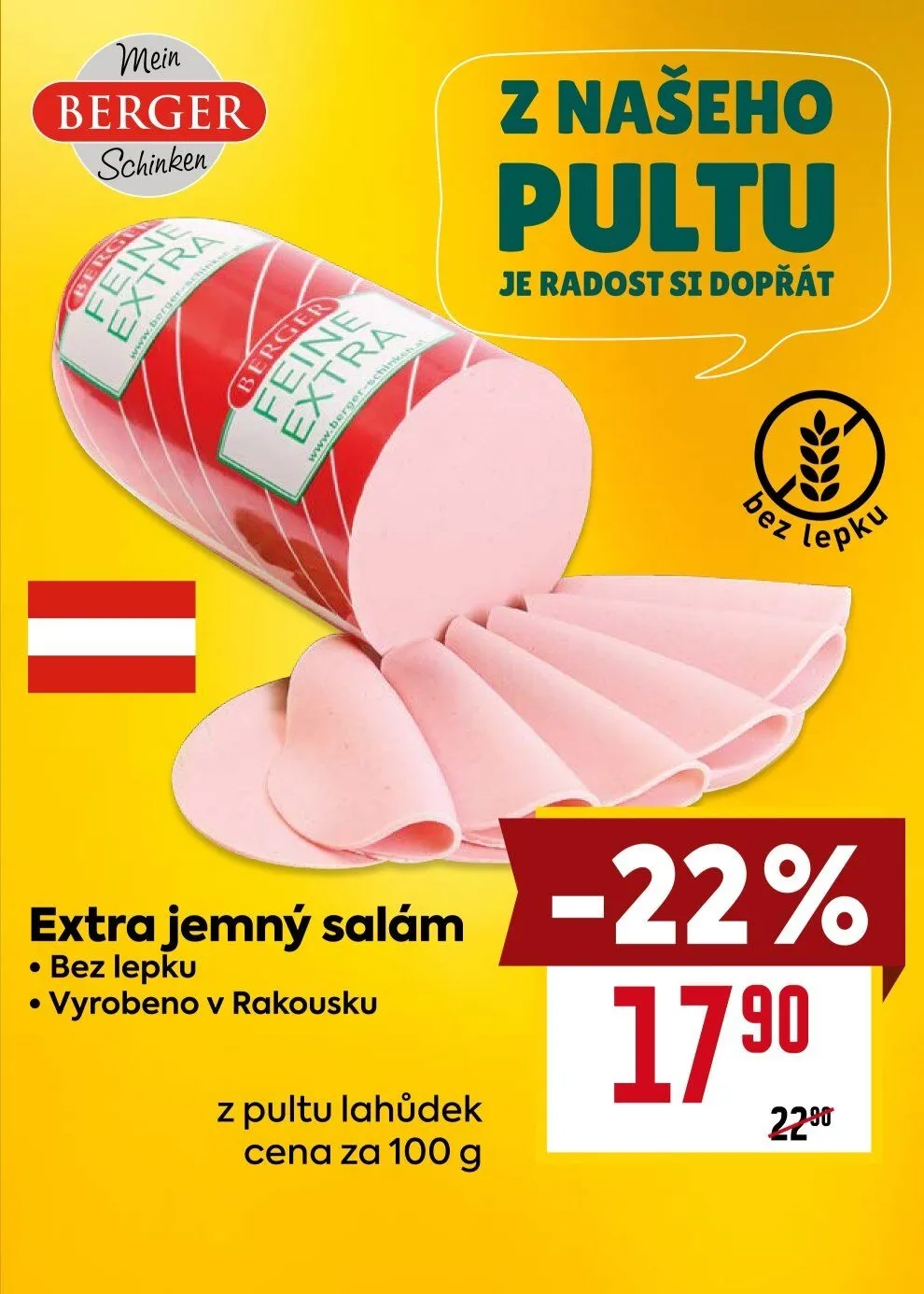 V letáku obchodu BILLA najdete skvělou nabídku produktů, které potěší vaše chuťové pohárky. Mezi nimi se nachází extra jemný salám Reinberger, který je bez lepku a vyrobený v Rakousku. Tento lahodný salám je k dostání z pultu lahůdek a cena za 100 g je velmi příznivá. Nezapomeňte, že nyní můžete využít slevu 22 % a udělat si radost kvalitními delikatesami!