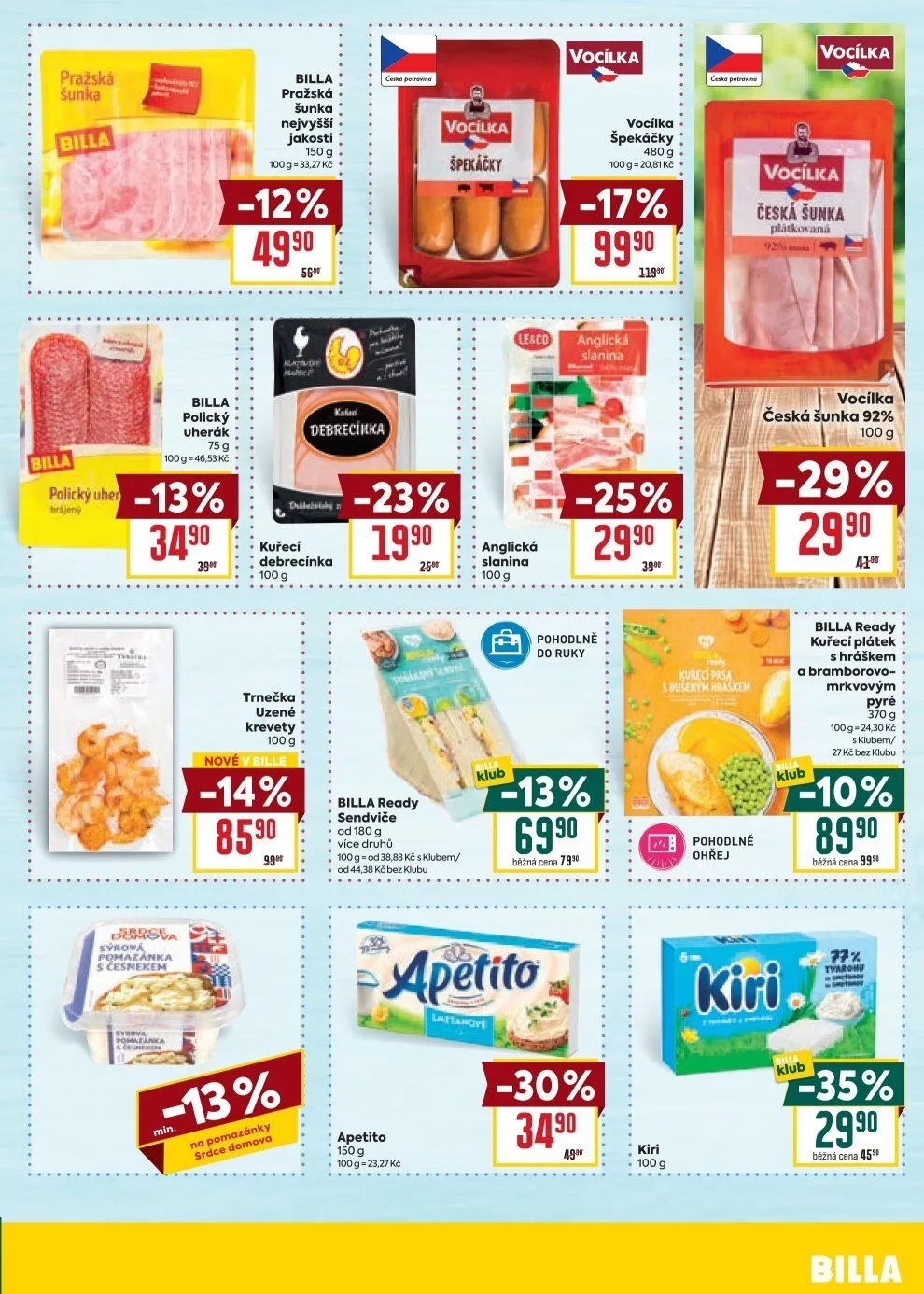 V letáku obchodu BILLA najdete širokou nabídku kvalitních produktů. Mezi nimi se objevuje pražská šunka nejvyšší jakosti v balení 150 g za cenu 49,90 Kč. Dále je v nabídce polický uherák 75 g se slevou 13 %, nyní za 34,90 Kč.