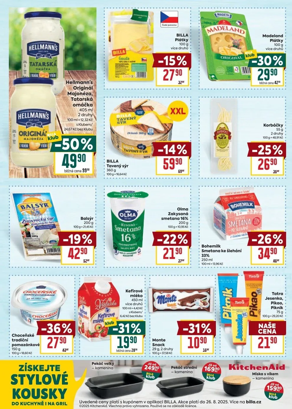 Nezapomeňte také na tradiční pomazánkové sýry a stylové kuchyňské kousky, jako jsou pekáče a misky z kameniny. Všechny ceny jsou uvedeny s možností využití klubových slev. Akce platí do 26. 8. 2025. Navštivte billa.cz pro více informací!