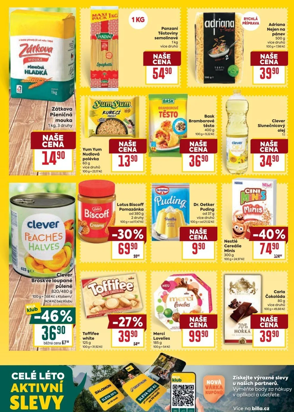 V letáku obchodu BILLA najdete širokou nabídku produktů za skvělé ceny. Mezi nimi je například pšeničná mouka Adriana 1 kg, ideální pro rychlou přípravu pokrmů, nebo bramborové těsto Bask 400 g. Pro milovníky těstovin máme semolinové těstoviny Panzani 1 kg a také nudlovou polévku v praktickém balení 60 g.