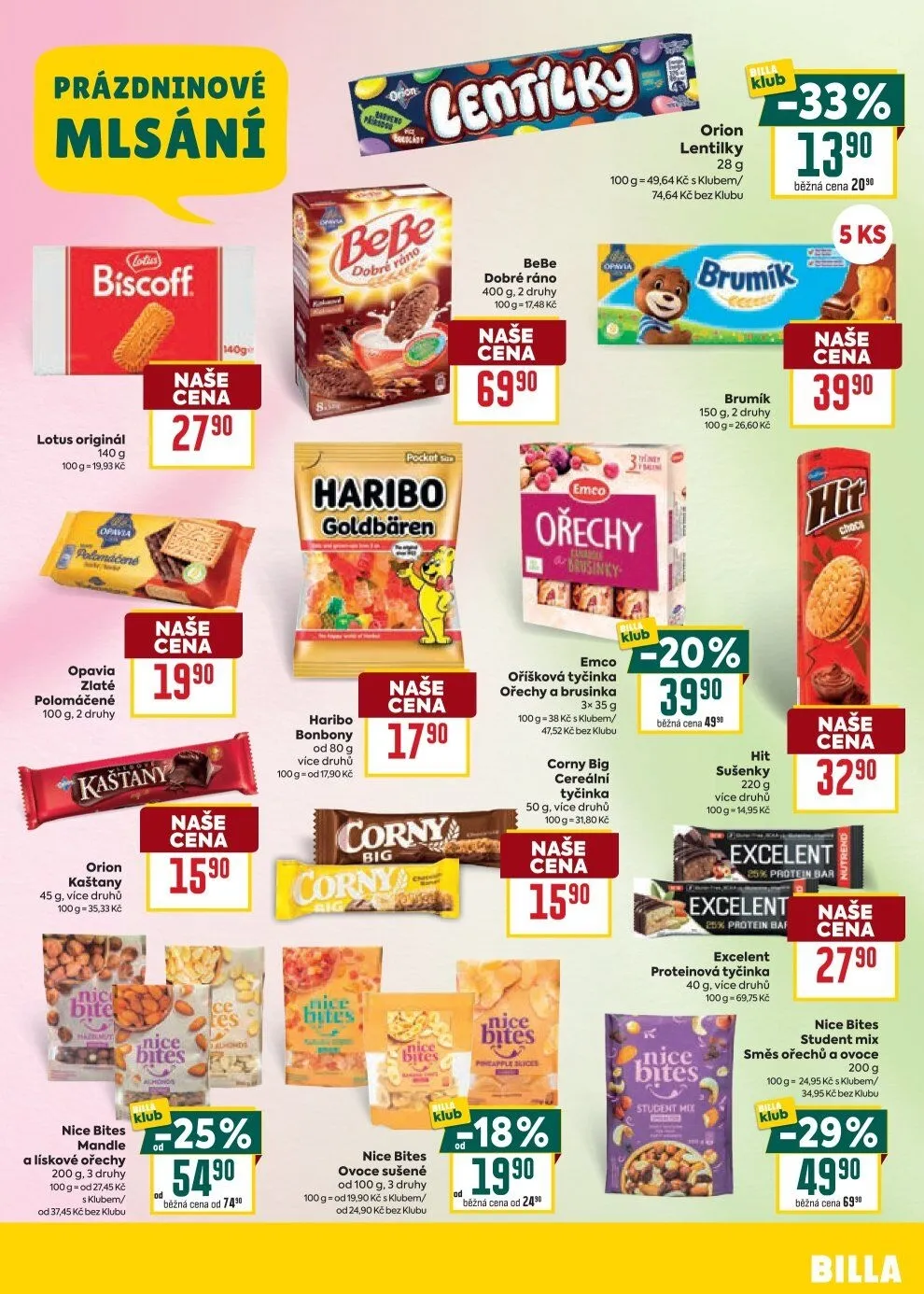 V letáku obchodu BILLA najdete širokou nabídku prázdninového mlsání. Mezi oblíbené produkty patří bíscoff 100 g, Orion lentilky 28 g a Lotus originál 140 g. Na své si přijdou i milovníci polomáčených sušenek Opavia, které jsou k dostání ve dvou druzích.