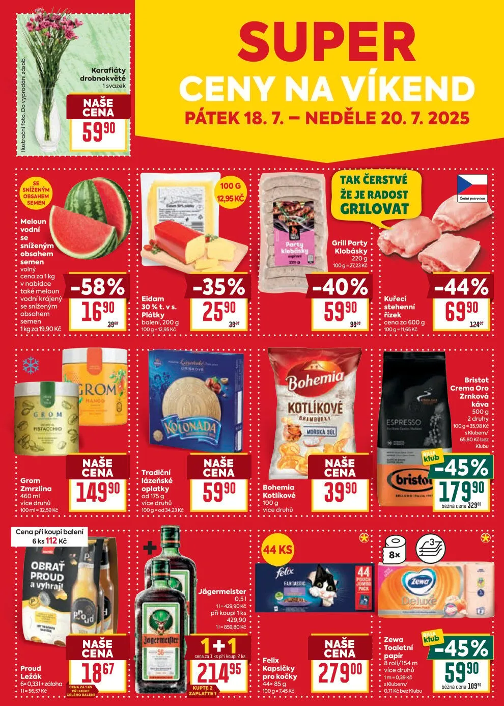 V letáku obchodu BILLA na víkend od pátku 18.7. do neděle 20.7.2025 najdete skvělé nabídky. Připravte se na grill party s klobáskami o hmotnosti 220 g se sníženým obsahem semen. Nezapomeňte na osvěžující vodní meloun, který je také k dispozici s nízkým obsahem semen za cenu 19,90 Kč za 1 kg.