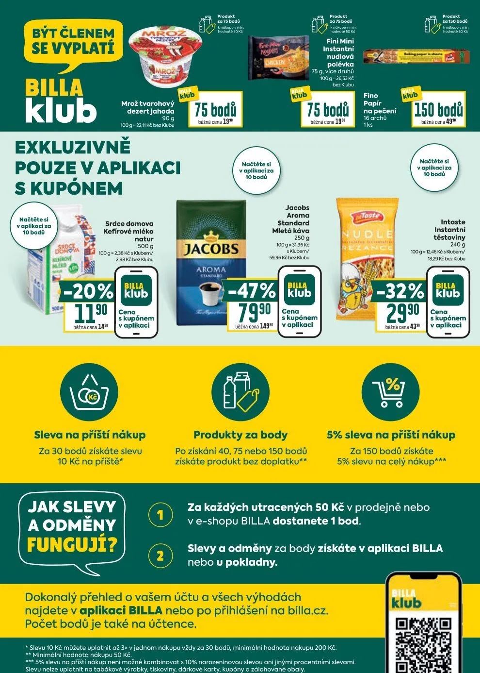 S každým nákupem sbíráte body, které můžete proměnit na slevy a odměny. Například za 150 bodů získáte 5% slevu na příští nákup. Všechny výhody a aktuální stav bodů můžete sledovat v aplikaci BILLA nebo na webu. Nezapomeňte, že slevy a odměny platí za každých utracených 50 Kč.