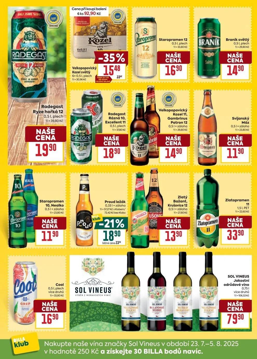 Další zajímavou nabídkou je Radegast Rázná 10, plechovka 1 l, za 18,90 Kč. Pro milovníky vína máme vína značky Sol Vineus, která jsou k dostání od 79,90 Kč. Navíc, pokud nakoupíte vína v hodnotě 250 Kč v období od 23.7. do 5.8.2025, získáte 30 BILLA bodů navíc.