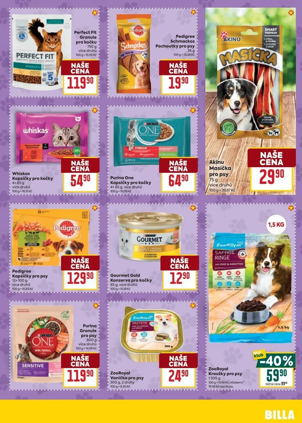 V letáku obchodu BILLA najdete širokou nabídku produktů pro vaše domácí mazlíčky. Mezi nimi jsou granule Perfect Fit pro kočky v balení 750 g za cenu 119,90 Kč. Dále nabízíme kapsičky Whiskas pro kočky (85 g) a také kapsičky pro psy Pedigree (12x 100 g) za 54,90 Kč. Pro milovníky kvalitní stravy máme konzervy Gourmet Gold pro kočky (85 g) a masíčka Akina pro psy. Nezapomeňte také na pochoutky Schmackos pro psy (36 g) a kroužky Zooroyal (1 500 g). Všechny produkty jsou dostupné v různých variantách a za výhodné ceny. Navštivte nás a potěšte své mazlíčky!