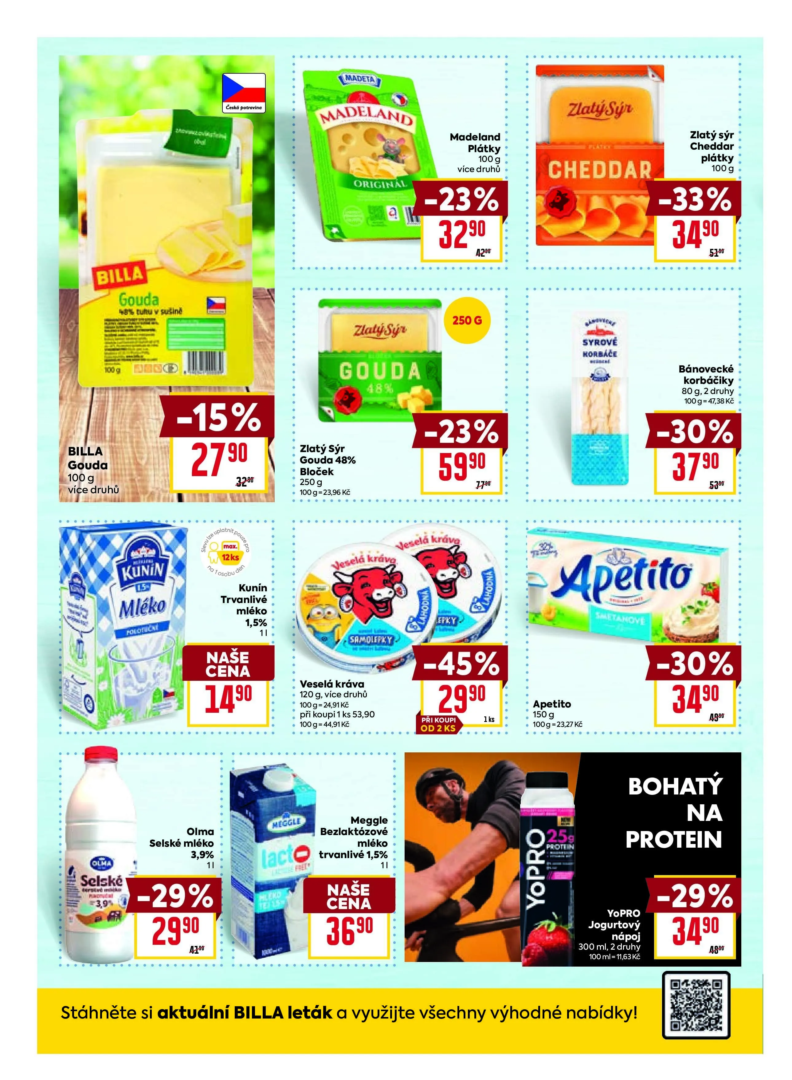 V letáku obchodu BILLA najdete širokou nabídku kvalitních produktů. Mezi nimi se objevuje oblíbený sýr Gouda s obsahem tuku 48%, který je k dispozici za skvělou cenu 249 Kč za 250 g. Dále nabízíme trvanlivé mléko za 149 Kč, které je ideální pro každodenní použití. Nezapomeňte také na jogurtový sýr, který je bohatý na protein a nyní je v akci za 349 Kč. Využijte všechny výhodné nabídky a stáhněte si aktuální leták BILLA!