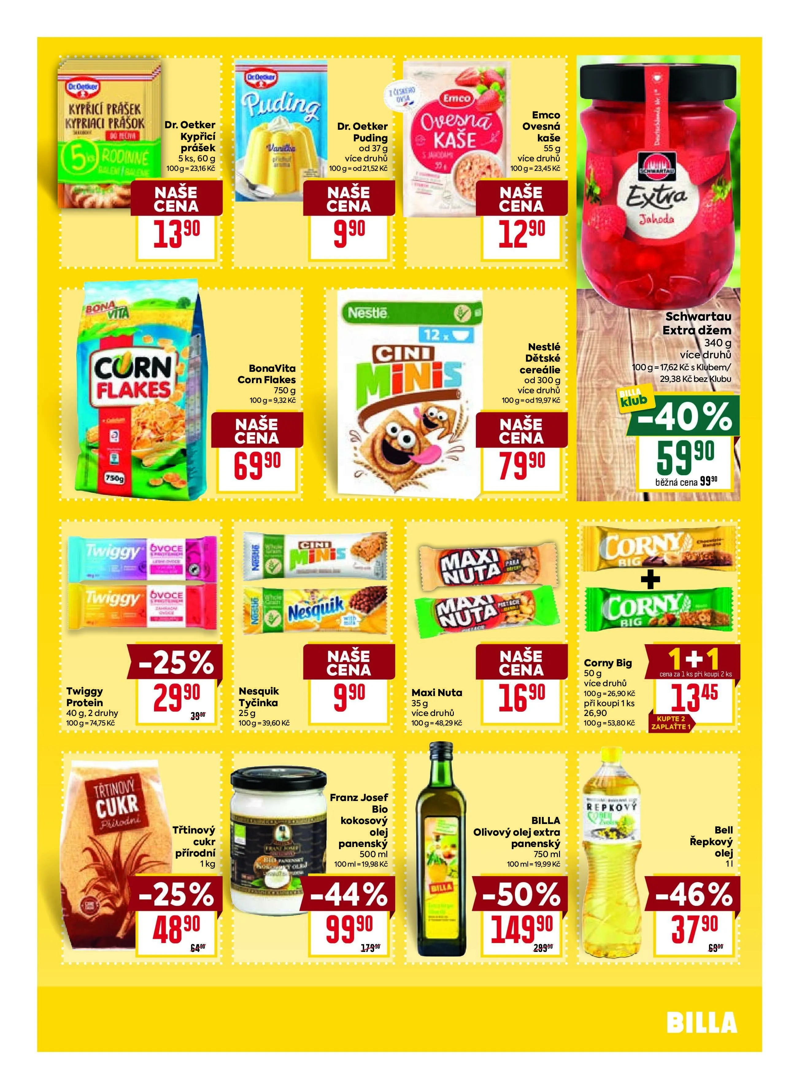 V letáku obchodu BILLA najdete širokou nabídku produktů za skvělé ceny. Mezi nimi je například prášek Dr. Oetker (60 g) za 13,90 Kč. Dále nabízíme corn flakes a puding od 37 g, každý za 9,90 Kč. Nezapomeňte také na Cini, které jsou k dostání za stejnou cenu.
