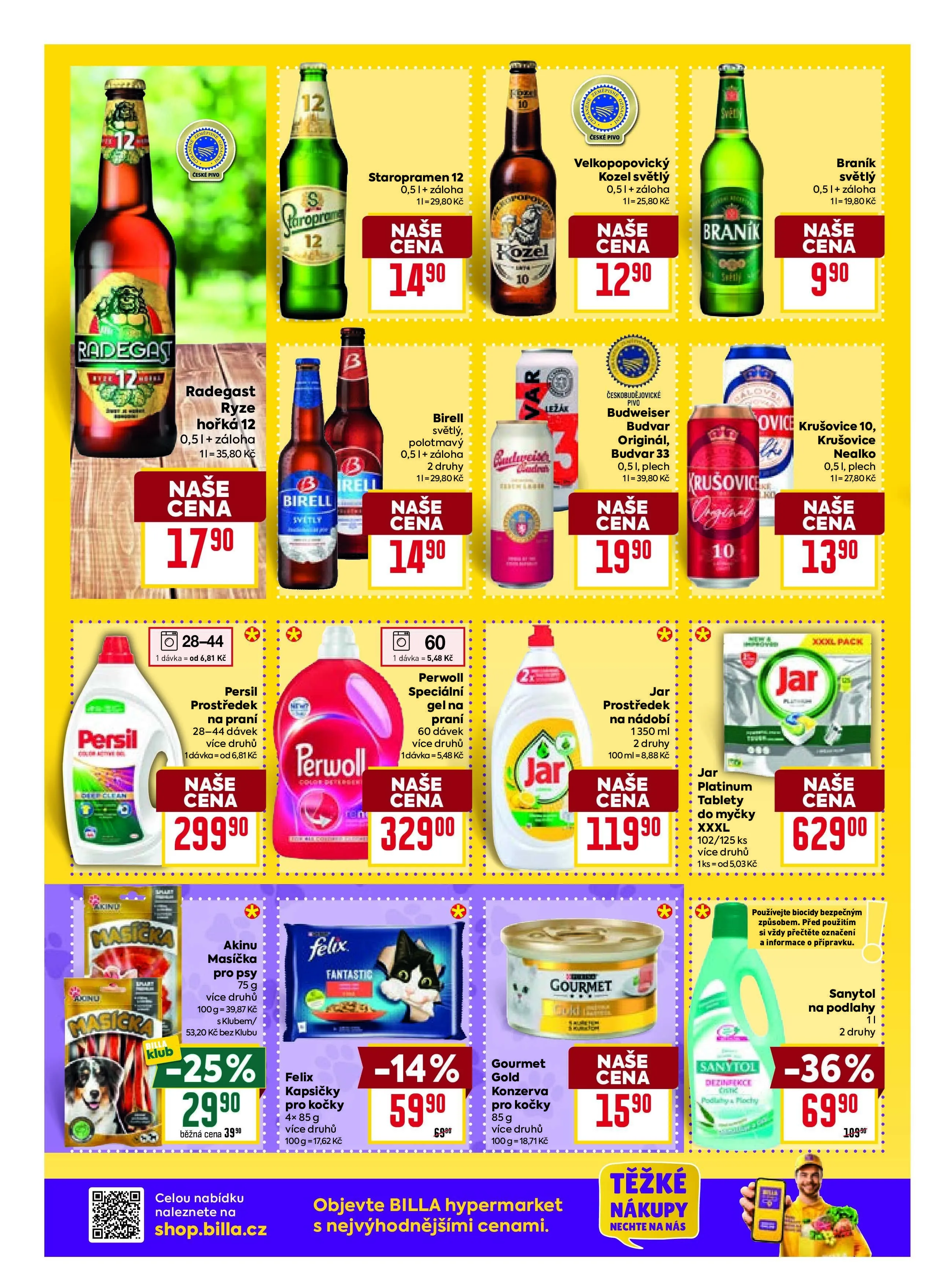 V letáku obchodu BILLA najdete širokou nabídku produktů za skvělé ceny. Mezi nimi se objevují oblíbené značky jako Staropramen 12 za 14,90 Kč, Budweiser Budvar originál za 11,50 Kč a Perwoll za 29,90 Kč. Nezapomeňte také na masíčka s 25% slevou a Jar na mytí nádobí za 12,90 Kč. Pro milovníky koček máme Gourmet s 36% slevou. Navštivte náš e-shop na shop.billa.cz a objevte další výhodné nabídky. Nákupy u nás jsou vždy výhodné!