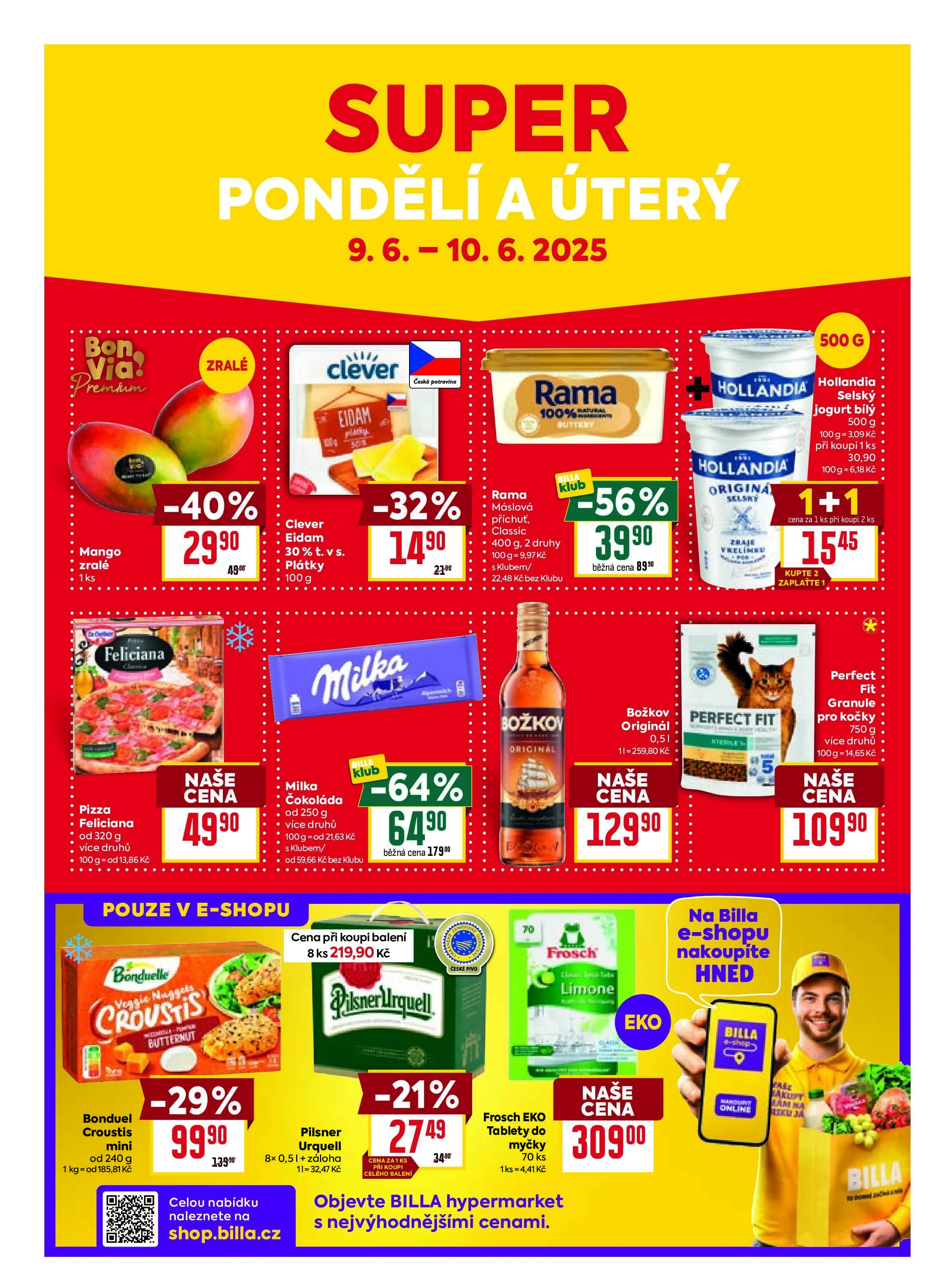V letáku obchodu BILLA na období od 9. 6. do 10. 6. 2025 najdete skvělé akční nabídky. Zralé mango je nyní za výhodnou cenu, stejně jako pizza s výraznou slevou 32%. Selský jogurt z Holandska je k dostání s 40% slevou. Nezapomeňte také na eidam plátky a čokoládu Milka, které jsou nyní za skvělé ceny. Pro majitele domácích mazlíčků máme granule Perfect Fit s 64% slevou. Všechny produkty můžete zakoupit i na e-shopu BILLA, kde najdete celou nabídku. Objevte BILLA hypermarket s nejvýhodnějšími cenami!