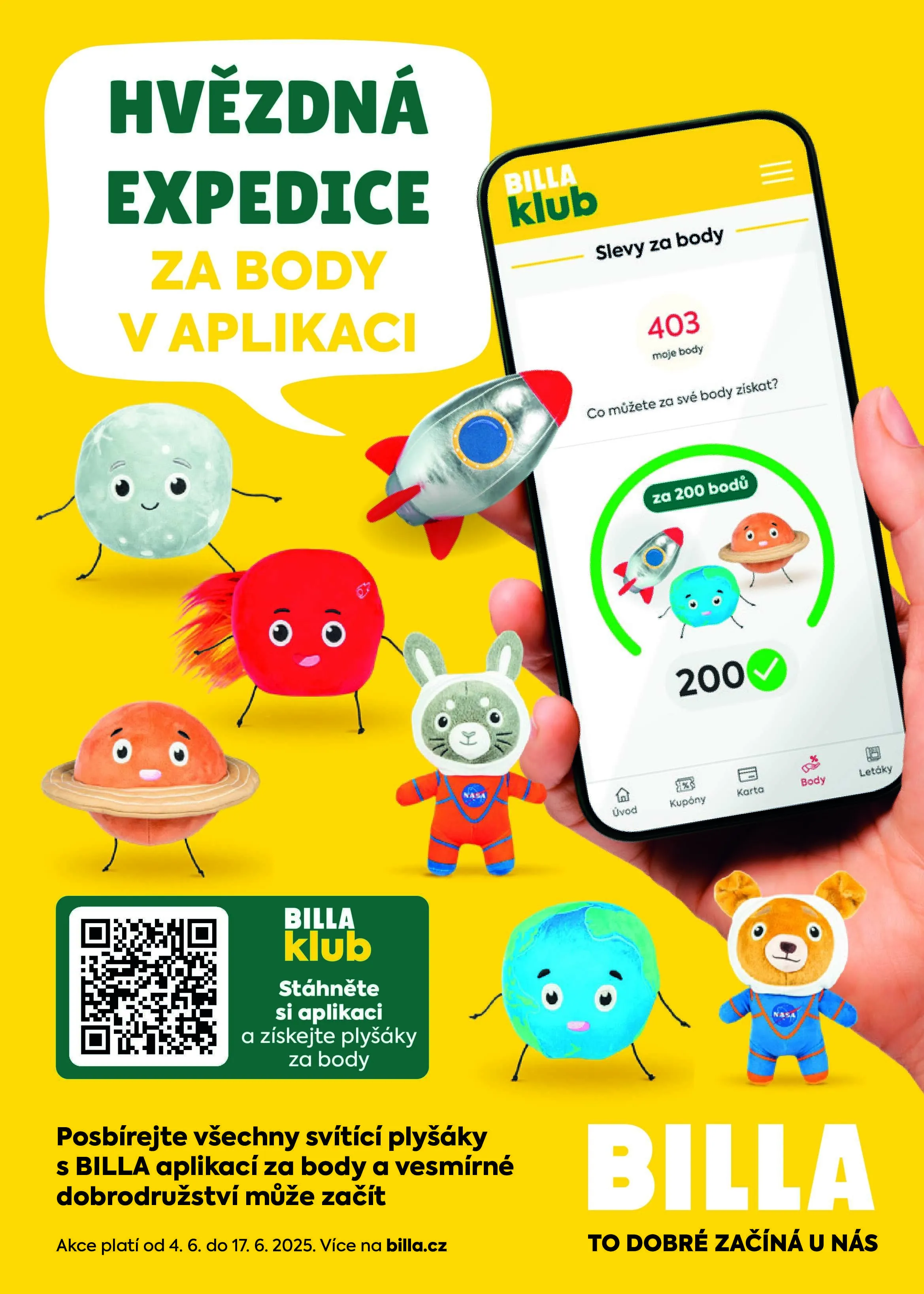 V letáku obchodu BILLA najdete skvělou akci s názvem "Hvězdná expedice". Stáhněte si aplikaci BILLA a získejte plyšáky za body z BILLA klubu. Můžete posbírat všechny svítící plyšáky a začít své vesmírné dobrodružství! Akce platí od 4.6. do 17.6.2025. Za 200 bodů si můžete vybrat svůj oblíbený plyšák. To dobré začíná u nás! Více informací naleznete na billa.cz.