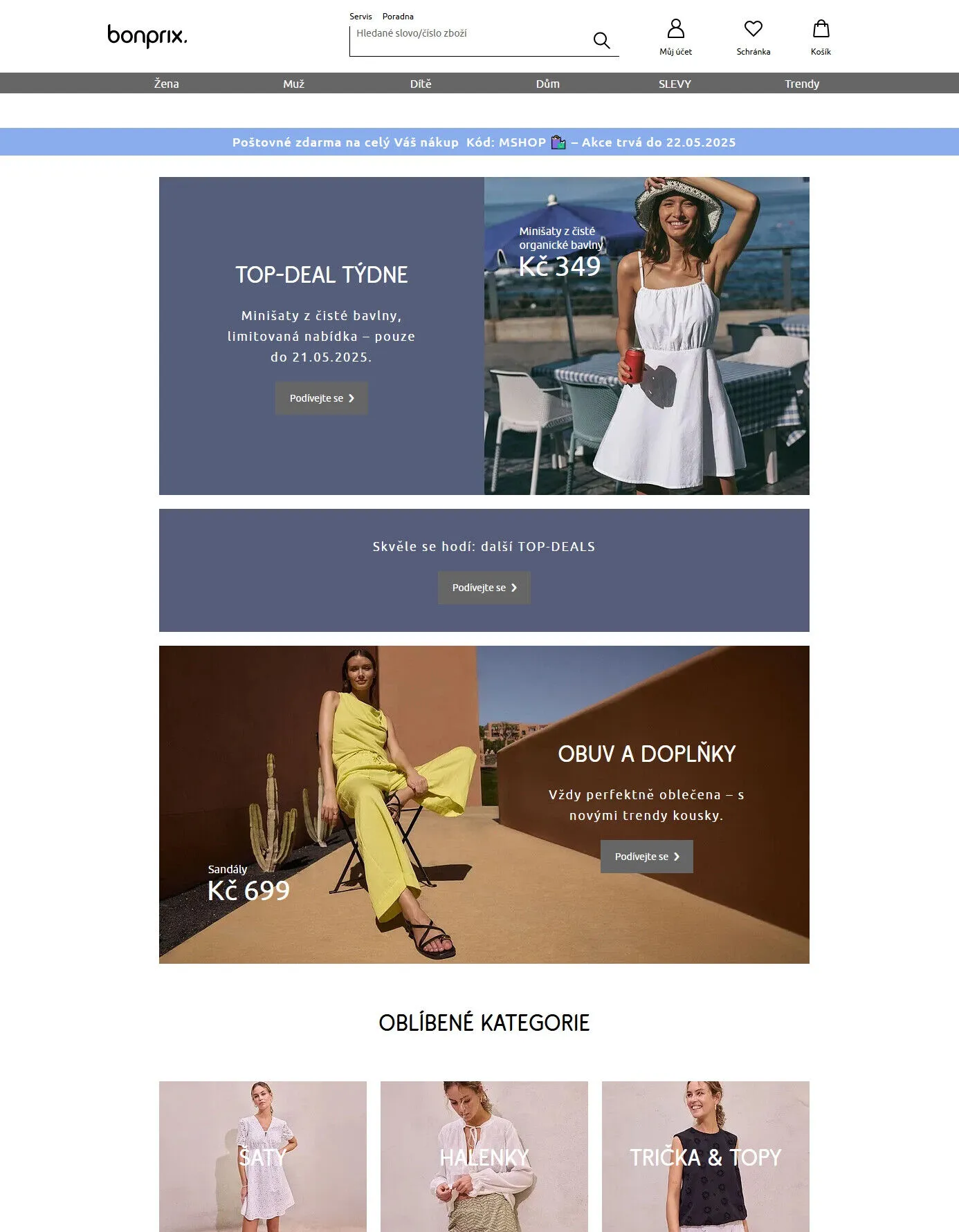 V letáku obchodu Bonprix najdete širokou nabídku produktů pro ženy, muže i děti. Mezi nejzajímavější kousky patří minišaty z čisté organické bavlny, které jsou součástí limitované nabídky platné do 21.05.2025. Nezapomeňte využít akci na poštovné zdarma s kódem mshoptô, která trvá do 22.05.2025. Dále si můžete prohlédnout trendy obuv a doplňky, které skvěle doplní váš outfit. Objevte také další top-deals a oblíbené kategorie, které vás jistě potěší!