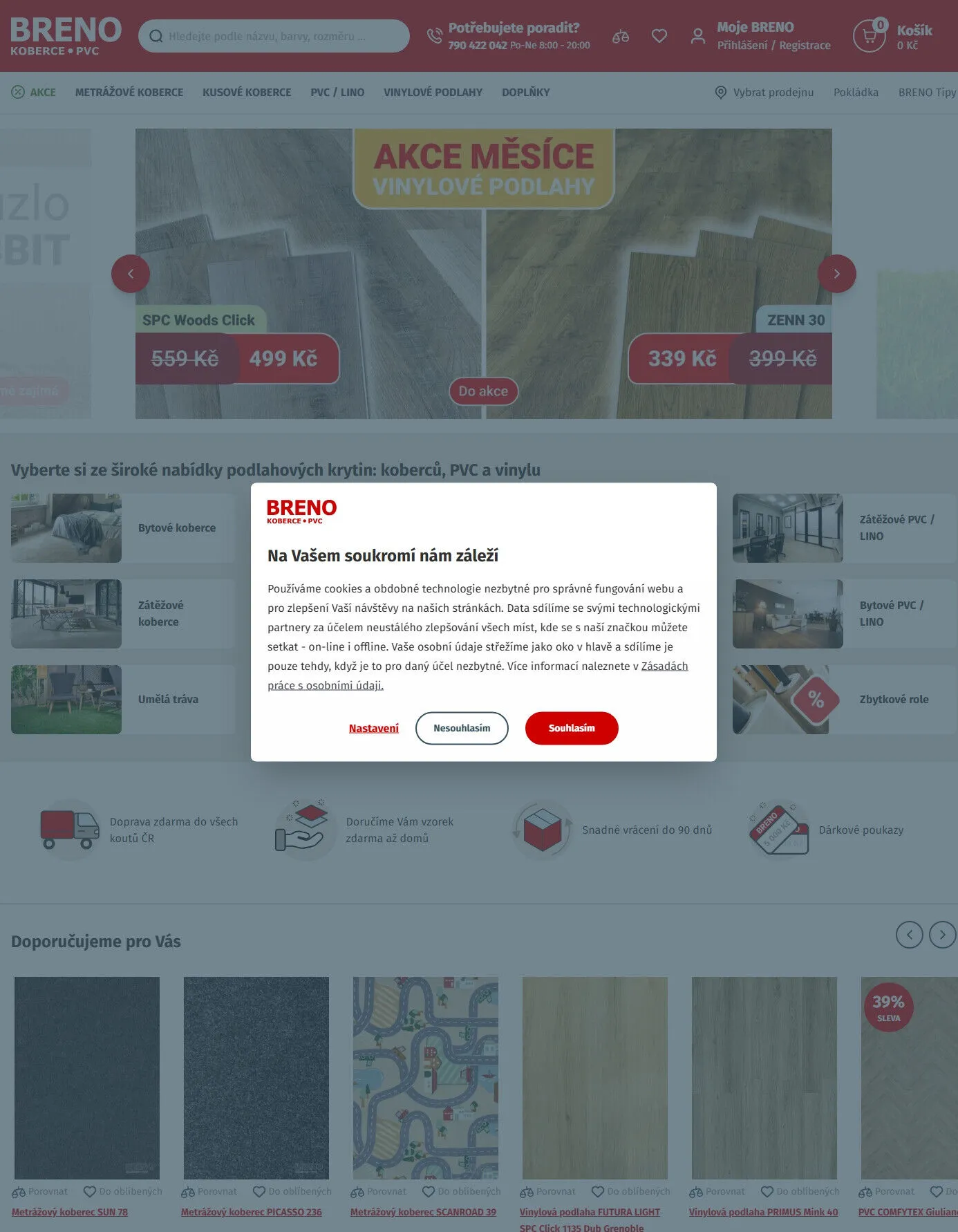 V letáku obchodu Breno najdete širokou nabídku koberců a podlahových krytin. Nabízíme metrážové koberce, kusové koberce, PVC a vinylové podlahy. V rámci akce měsíce si můžete vybrat z atraktivních cen, například zátěžový koberec Zenn 30 za 399 Kč nebo metrážový koberec Picasso 236. Doprava zdarma do všech koutů ČR a možnost objednání vzorku zdarma až domů jsou další výhody, které nabízíme. Nezapomeňte také na snadné vrácení do 90 dnů. Pokud potřebujete poradit, neváhejte nás kontaktovat na telefonním čísle 790 422 042.