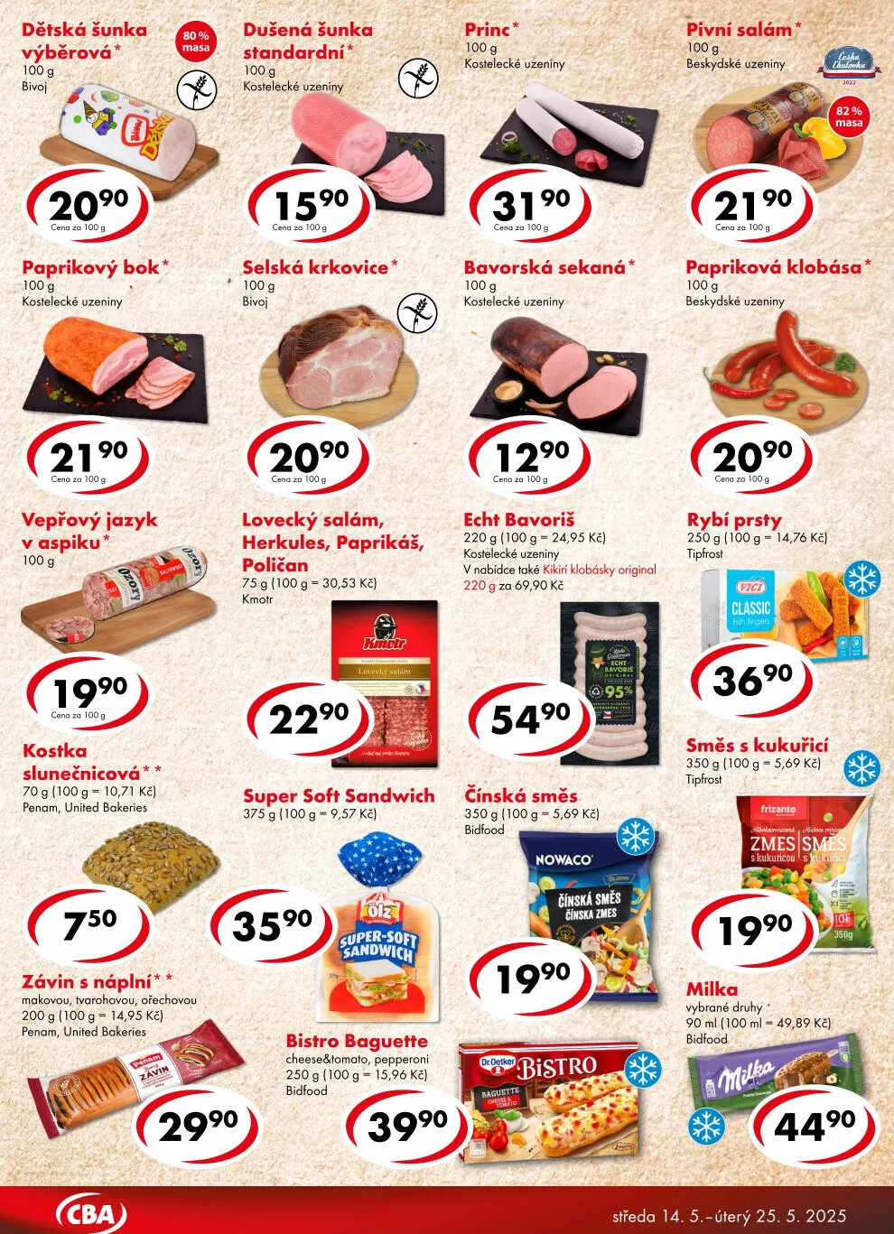 V letáku obchodu CBA najdete širokou nabídku kvalitních produktů. Mezi nimi se objevuje dětská šunka, výběrová, a také paprikový bok od Kosteleckých uzenin. Pro milovníky uzenin je tu vepřový jazyk v aspiku a pivní salám. Nechybí ani dušená šunka standardní a selské krkovice.