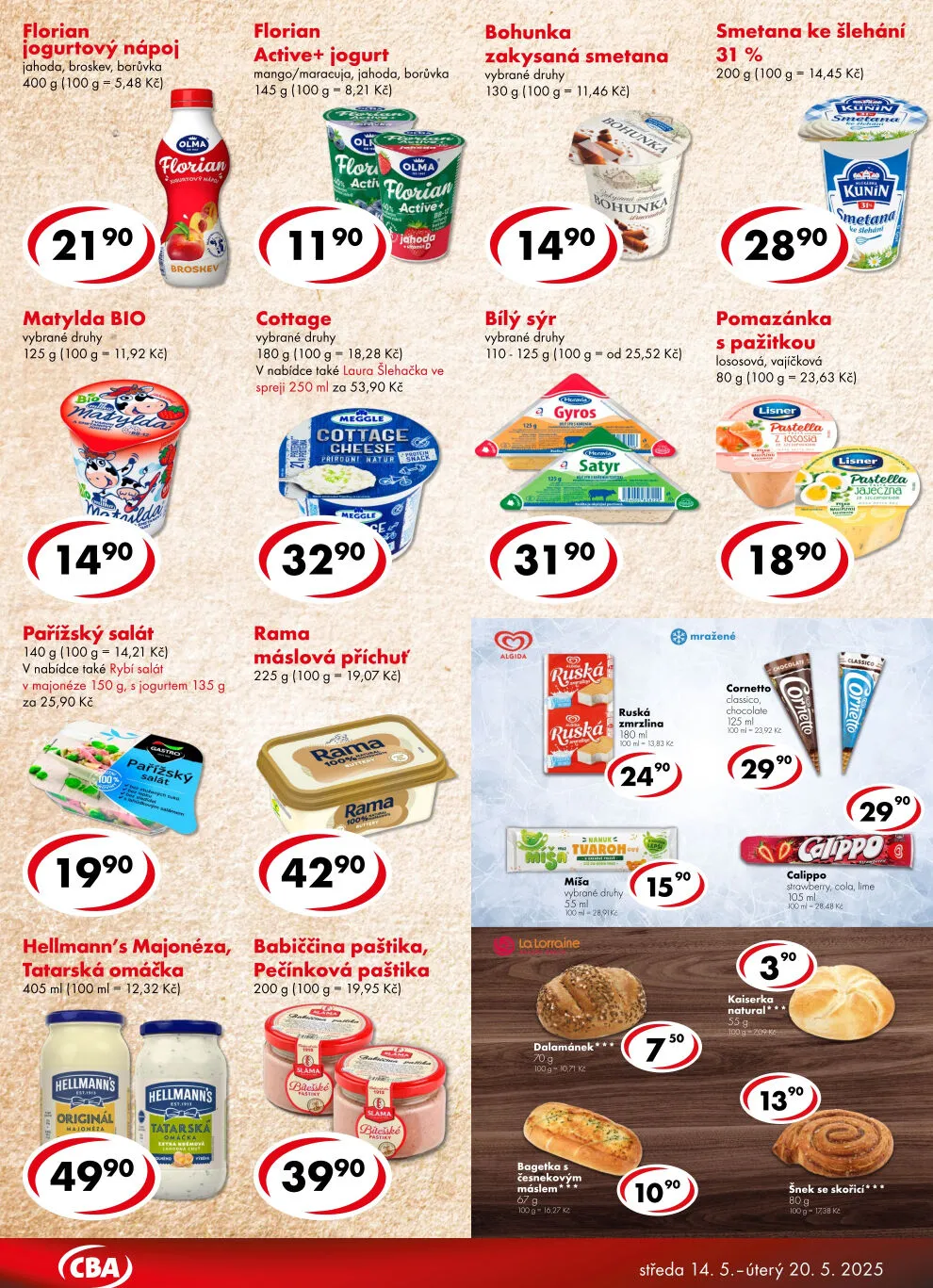 V letáku obchodu CBA najdete širokou nabídku kvalitních produktů. Mezi nimi se objevují iogurtové nápoje značky Florian v příchutích jahoda, broskev a borůvka, balení 400 g za 21,90 Kč. Dále nabízíme Matyldu bio jogurty vybrané druhy za 11,92 Kč za 125 g.