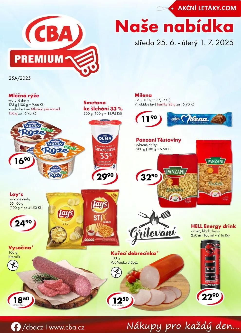 V letáku obchodu CBA najdete širokou nabídku kvalitních produktů. Mezi nimi je mléčná rýže vybraných druhů o hmotnosti 175 g za 16,90 Kč, nebo mléčná rýže natural 150 g za 16,90 Kč. Dále nabízíme smetanu ke šlehání 33 % v balení 200 g za 14,95 Kč.