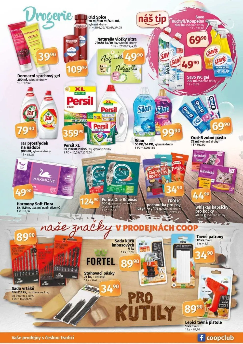 V letáku obchodu COOP najdete širokou nabídku produktů pro každodenní potřeby. Mezi nimi jsou oblíbené sprchové gely Dermacol (250 ml) za 159,60 Kč a prostředek na nádobí Jar (900 ml) za 88,78 Kč. Pro ženy doporučujeme vložky Naturella ultra (7 ks) za 139,80 Kč.