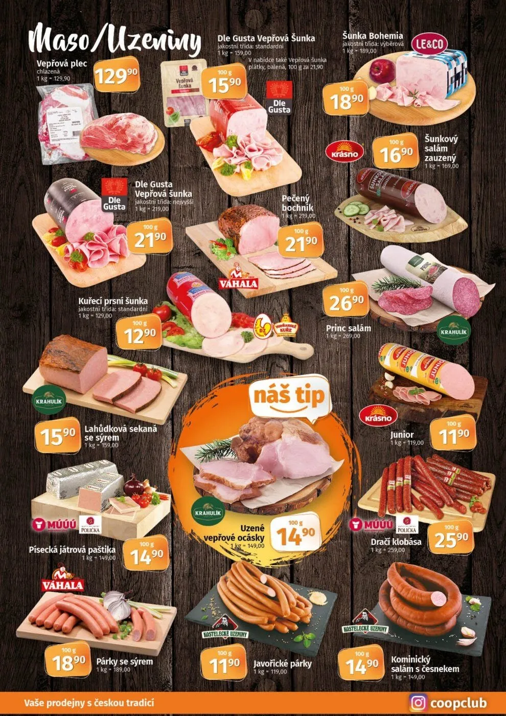 V letáku obchodu COOP najdete širokou nabídku kvalitních masných výrobků.