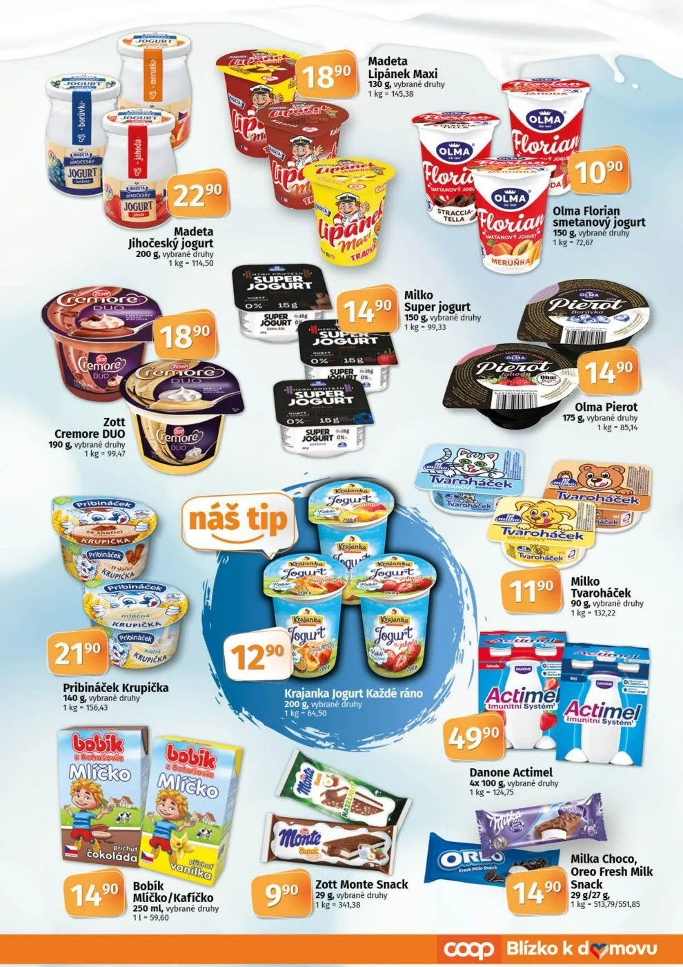 Pro milovníky sladkých pochoutek je tu Pribináček Krupička (140 g) a Zott Cremore Duo (190 g). Nezapomeňte také na Actimel (4x 100 g), který podporuje imunitní systém.