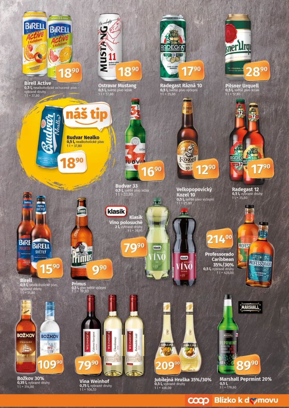 V letáku obchodu COOP najdete širokou nabídku nápojů a potravin. Mezi nealkoholickými pivy se objevují značky jako Birell a Budvar, které nabízejí různé příchutě a varianty. Pro milovníky světlého piva je k dispozici Ostravar Mustang a Velkopopovický Kozel.